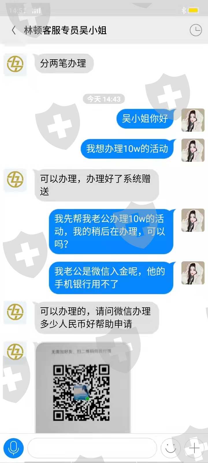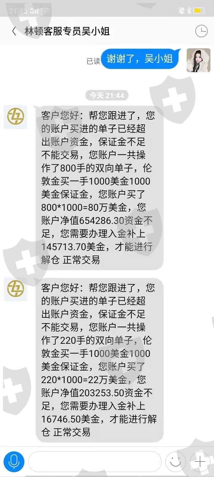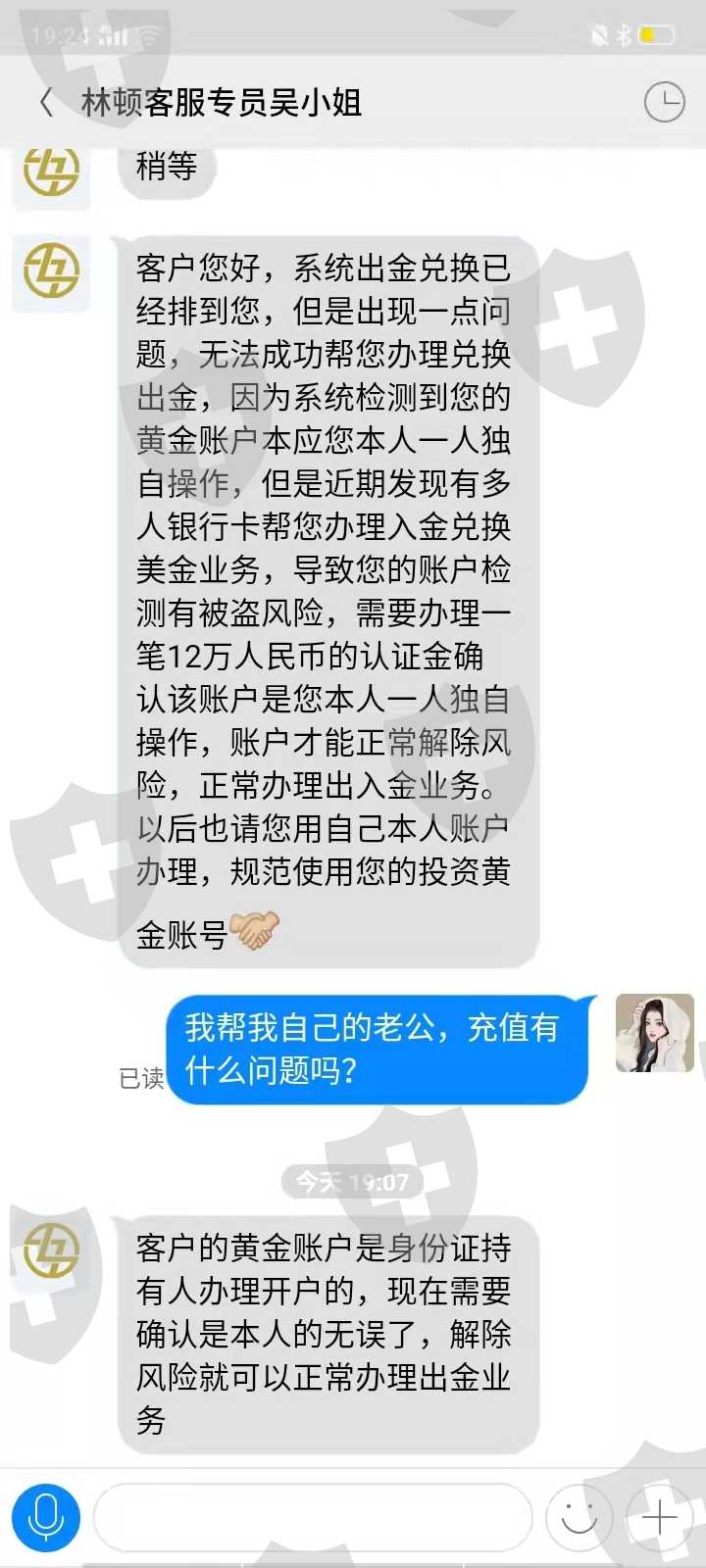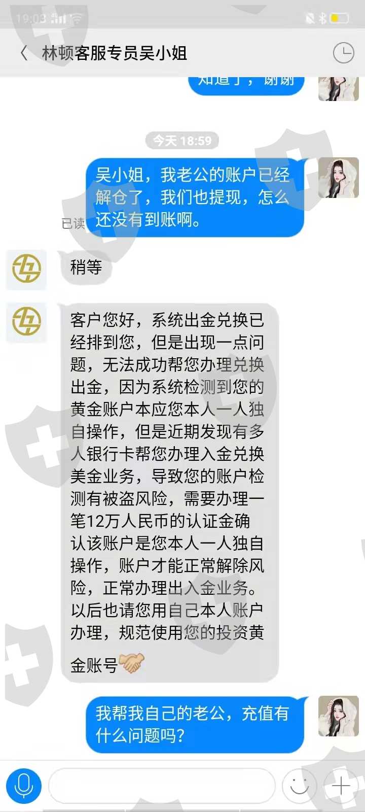 因为本人工作原因没办法使用手机银行入金,这个情况也是给林顿金融的吴小姐讲过的她也知道,每次入金前也都联系她了,后期入金都是按照她方法进行的;因为钱少的原因账户里面的一直没有取过,直到这周一四月四号黄总监操作了一下结果导致锁仓,需要16746.50美金解仓,我补足解仓金后又说我账户有被盗的风险需要交12万的保证金才能取钱,我不明白我一直按照她们的方法入的金造成的风险为什么需要我来承担,我也不知道这个保证金交了钱还能不能取出来,每次都是交完钱后又有新问题,这就像个无底洞一直往里投钱也见不到底,我现在已经没有钱再往里面投了还欠了别人很多钱,每天都是催债的消息没有办法了,只能在这上面投诉和报警寻求一点点的希望!!!
