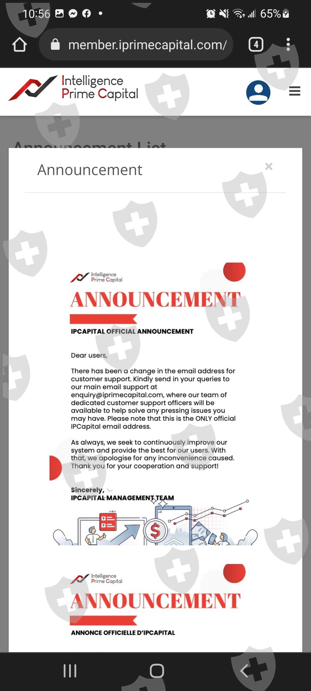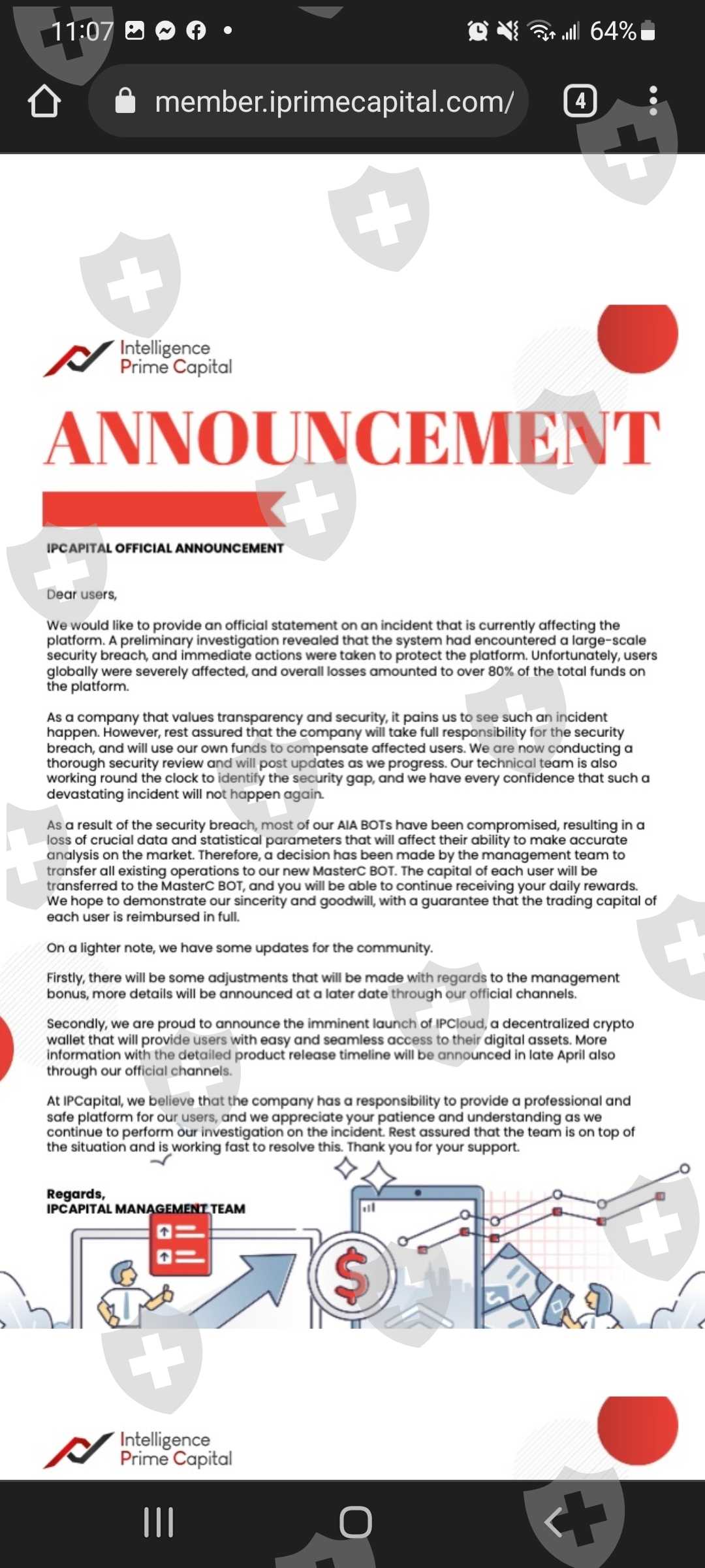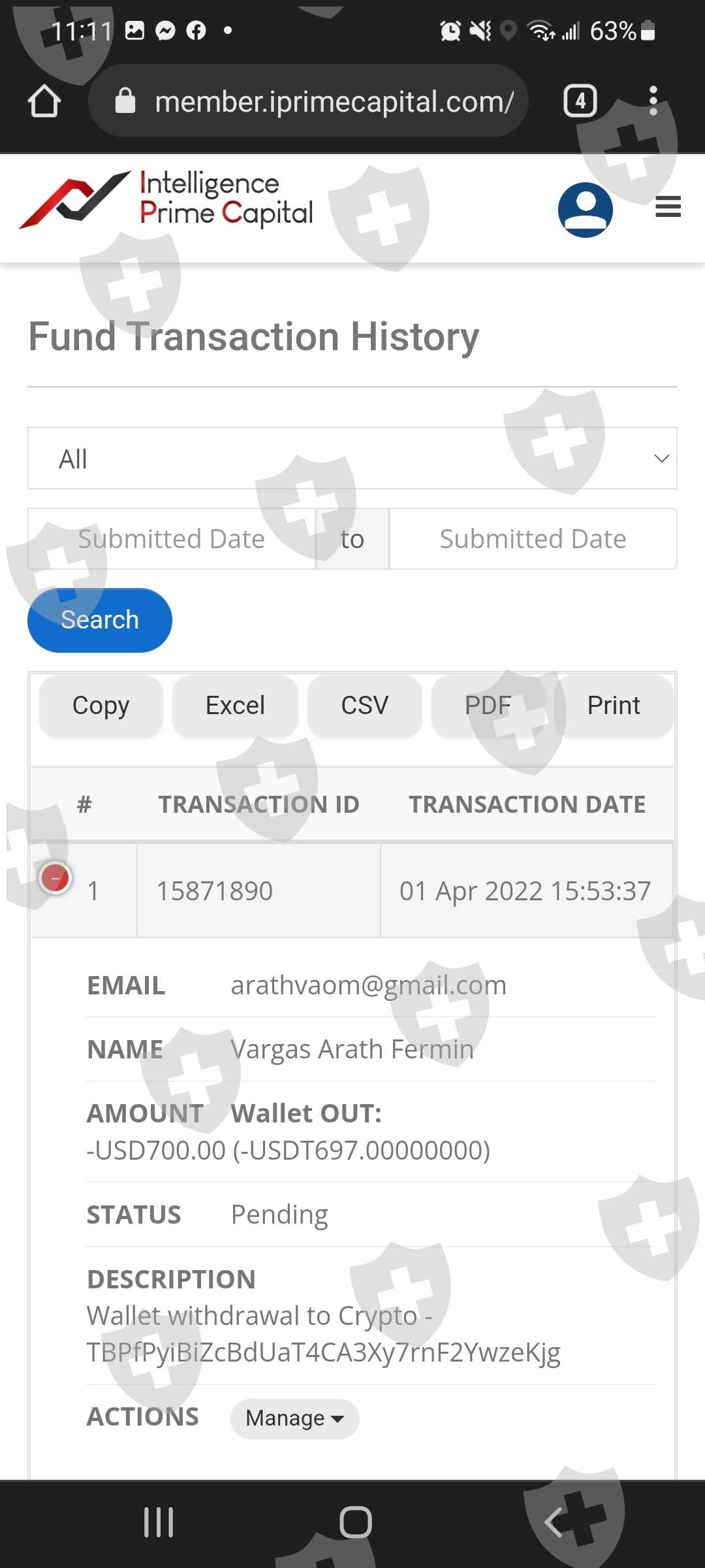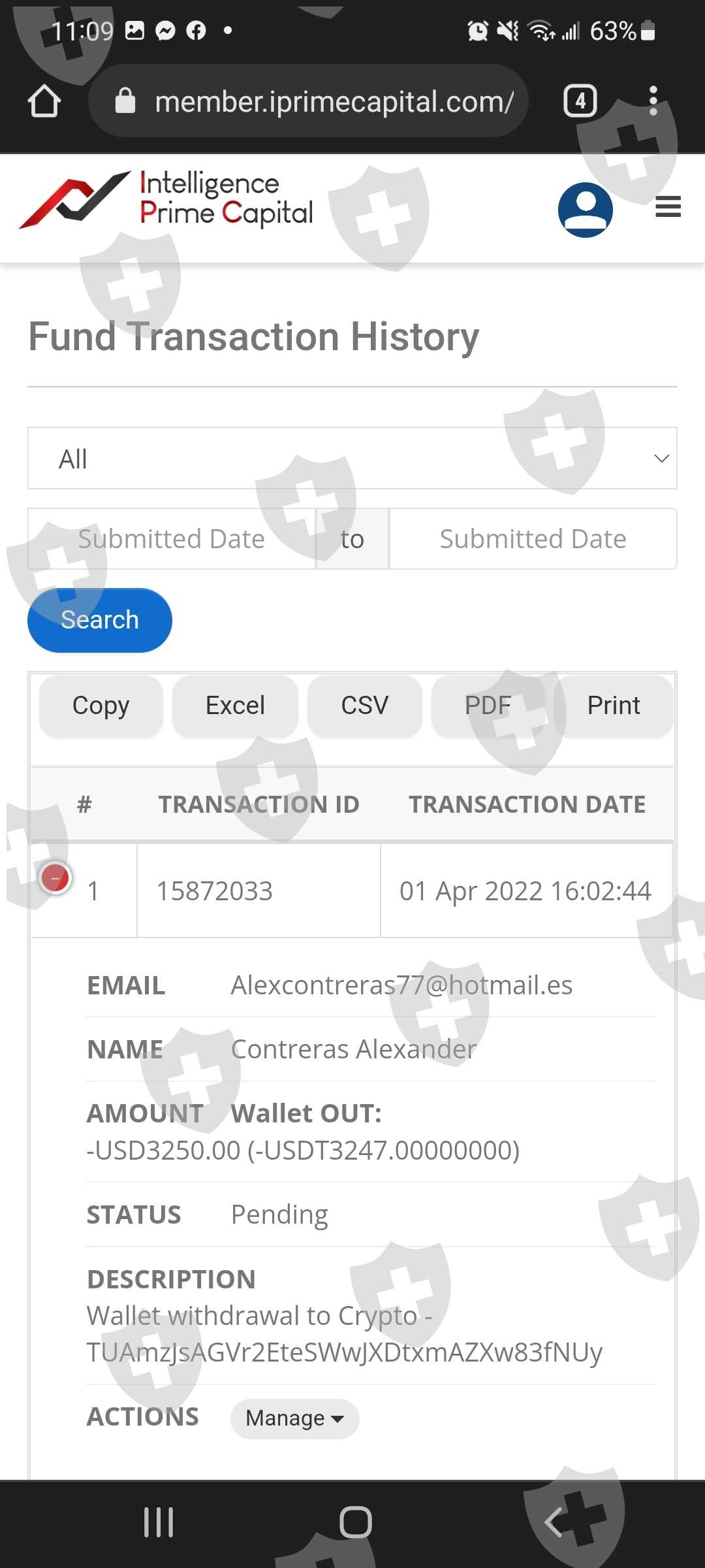 one with arathvaom@gmail.com and another with user Alexcontreras77@hotmail.es, in total I deposited almost 5500 usdt in the two wallets, in almost a month they have not responded to me about the returns or my money, I want an answer about this, no answer questions, they do not give clarifications of what is happening, they do not let me withdraw my money for anything in the world, I want my money and compensation. Intelligence prime capital doesn't send any answer and a lot of the people scared about the money.