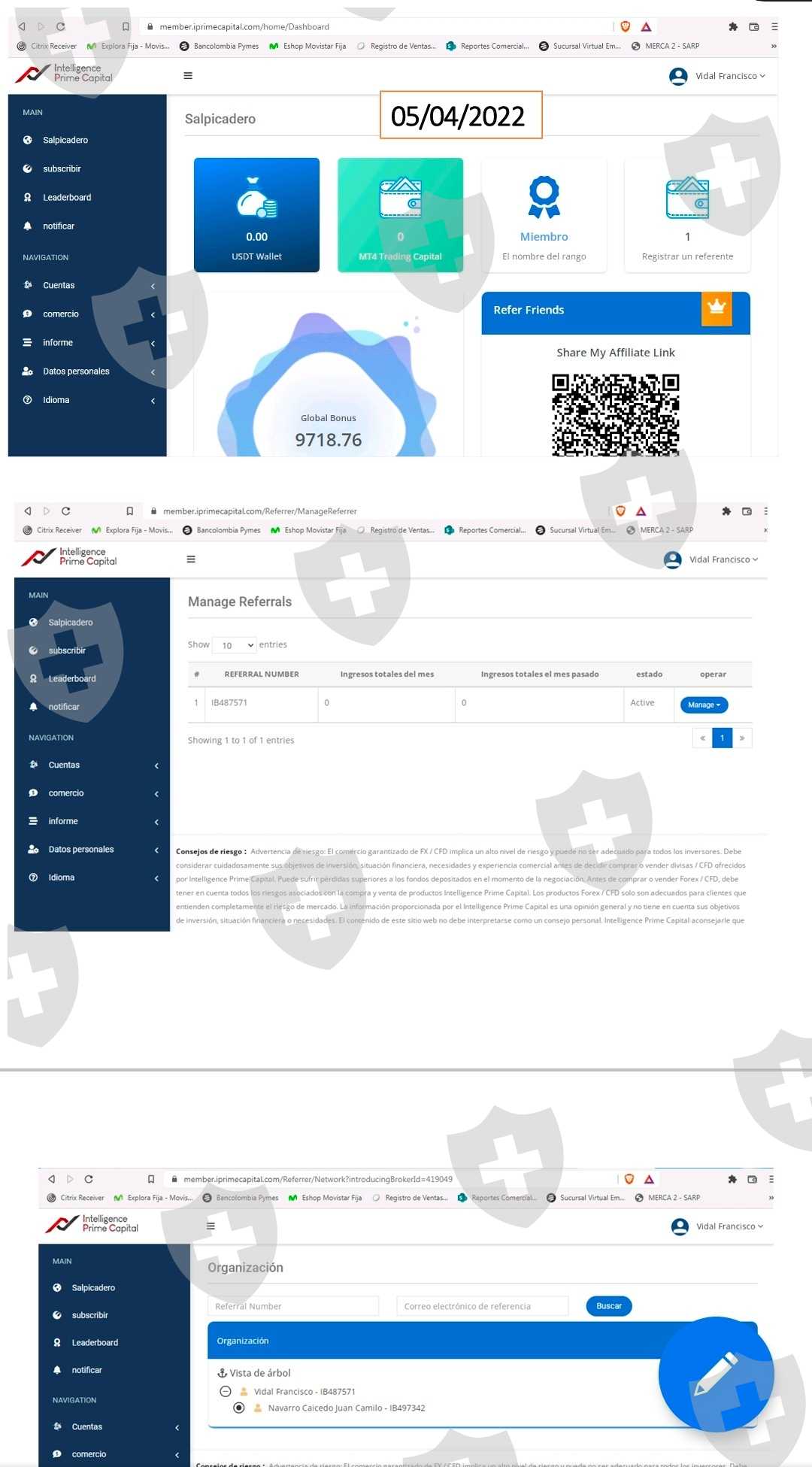 尊敬的 IPC, 敬请优先处理以下受去年 3 月计算机事件影响的案例。自去年 2022 年 4 月 5 日以来,我们多次向地址 enquiry@iprimecapital.com 发送电子邮件,主题为“Request_IPC_Francisco Vidal”,披露了案件的详细信息,迄今为止尚未收到任何类型的回复或确认。 Blue Wallet 和 MT4 账户中需要更新资金,因为它们目前显示为 0 美元。这是为了能够正常处置资金。我的详细信息是: 参考 ID:IB487571 MT4 ID:4422658 姓名:Francisco Vidal ID:1111796525 Blue Wallet 中的总可用余额:截至 2022 年 4 月 2 日,105,899 美元 MT4 ID 4422658 中的总可用余额:截至 2022 年 4 月 2 日,110.10 美元. *赞助线:推荐 ID:IB222726 MT4 ID:2940654 姓名:Brayan Diaz ID:1111796670 *推荐线:推荐 ID:IB497342 MT4 ID:4433918 姓名:Juan Camilo Navarro Caicedo 蓝色钱包中可用的总余额:截至 02 日,111,144 美元/ 2022 年 4 月 MT4 中的总可用余额 ID 4422658:截至 2022 年 4 月 2 日,1000.10 美元谢谢您,Francisco Vidal WhatsApp:3163966176