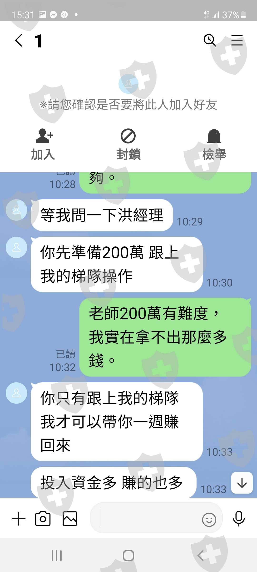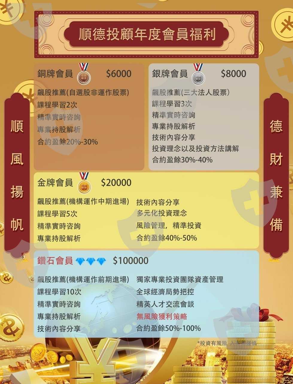 先以順德投顧的名字招募會員,教會員買股票,後來又說他們每年都會操作美指,誘騙入金買美指,使其爆倉,又要求入金,到結束又要收報酬金繳了報酬金又不出金,又要繳加急金。整個群組都是他們詐騙集團的人,要小心不要再有人被騙了。