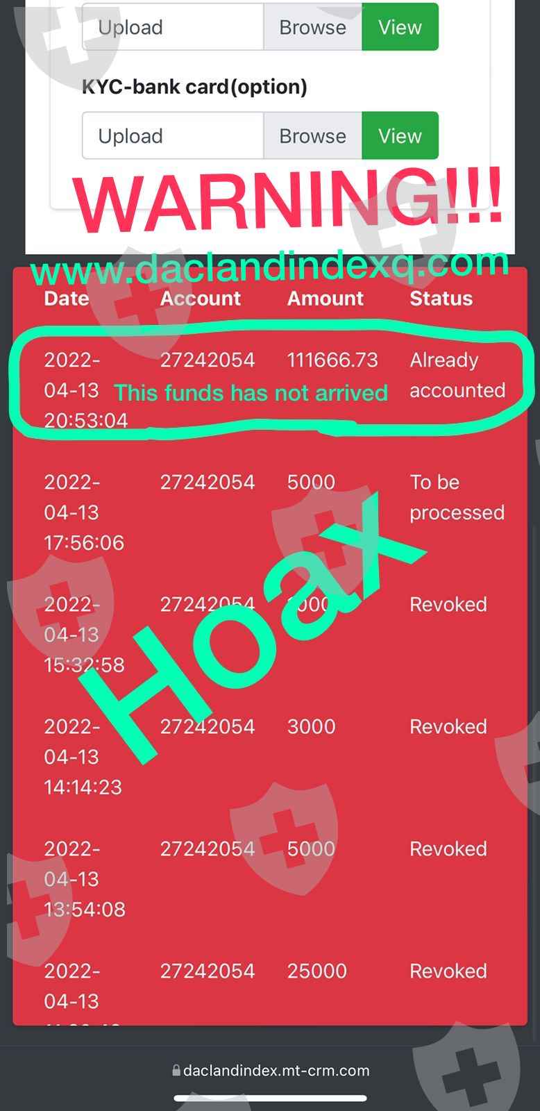 给Dacland Capital Limited(www. DACLAND indexq.com)请立即解决,否则我将继续向国际货币基金组织和国际高等法院报告此事,以跟进此事。我还将把它传播到所有世界贸易社区。对于 metatrader 5,请在您的申请中阻止此网站成为交易商。