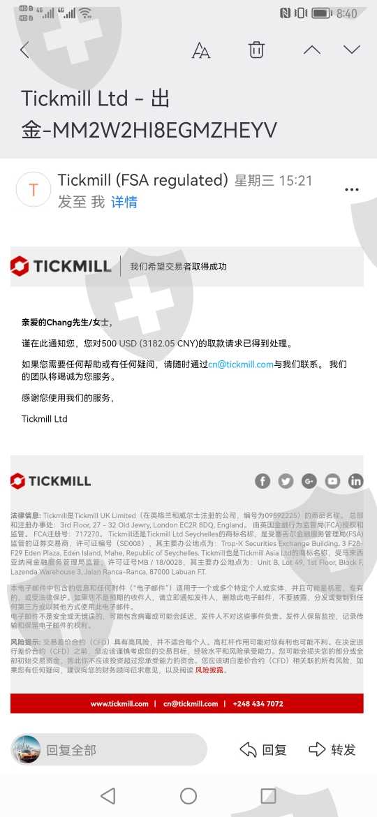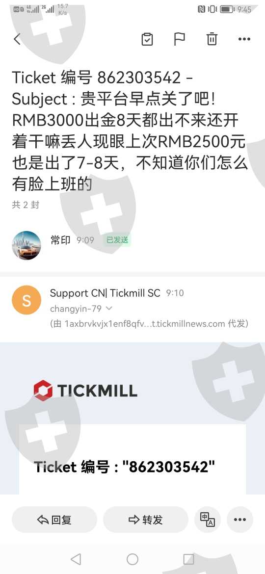tickmill平台要跑吗,2.14日出了400美元等了8天,现在3.6日出的500美到今天没有到账诚若的2-4天发邮件基本上不回要不然就是在联系支付商