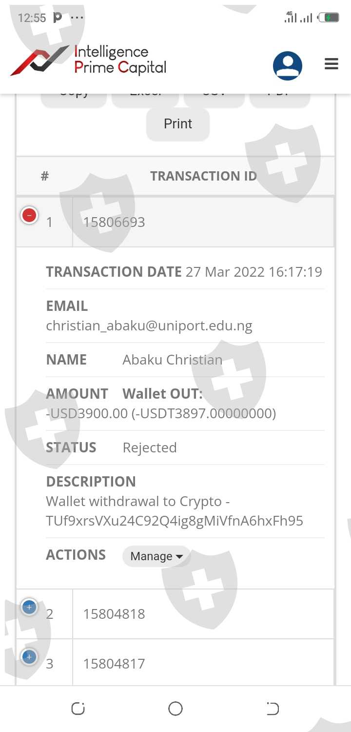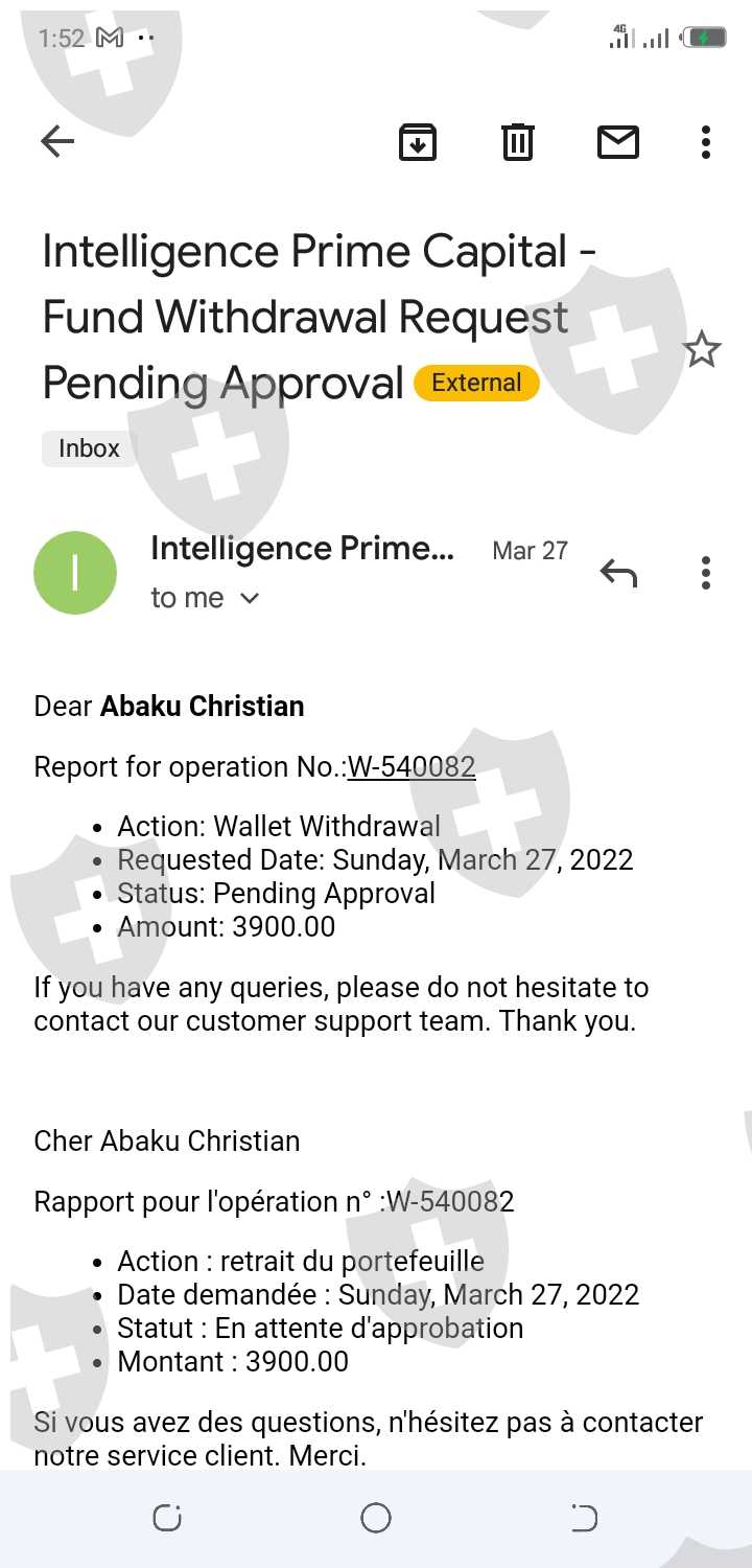 提款被拒绝:我的名字是abaku christian amieboye。我是IPCAPITAL上的投资者,交易账号为2807409,我于2022年3月27日将3900 美元(3,900.00 美元)的usdt trc 20提款到我的币安钱包地址 (tuf9xrsvxu24c92q4ig8gmivfna6hxfh95) 并被拒绝。直到今天2022年4月15日;提款既没有反映在我的币安钱包中,也没有返回到我的IPCAPITAL界面也没在mt4的帐户。我在此要求我的提款应立即获得批准,并立即转到到我上面的币安usdt trc 20钱包。以下附件是拒绝交易的证明和其他相关文件。我期待着积极的回应。您真诚的abaku christian amieboye +2348037157932