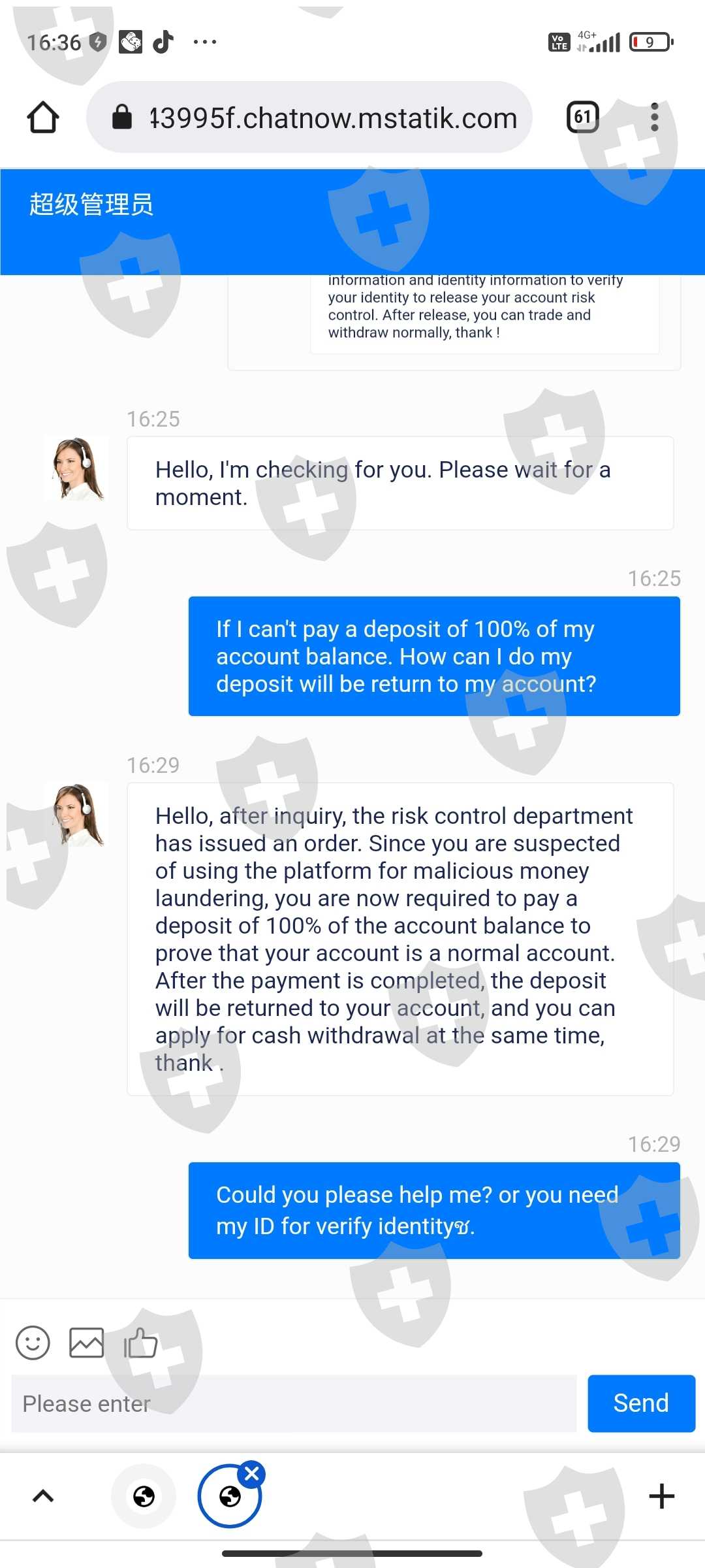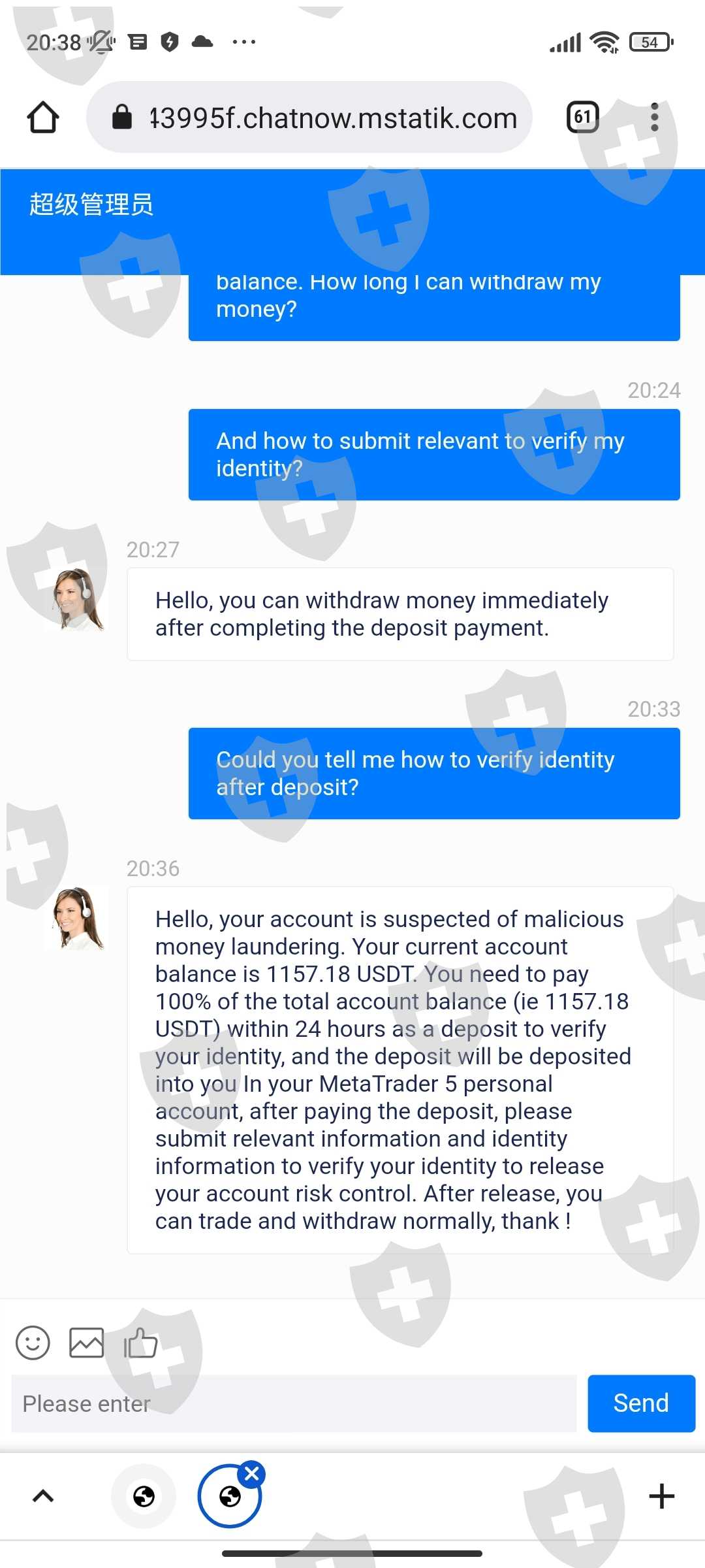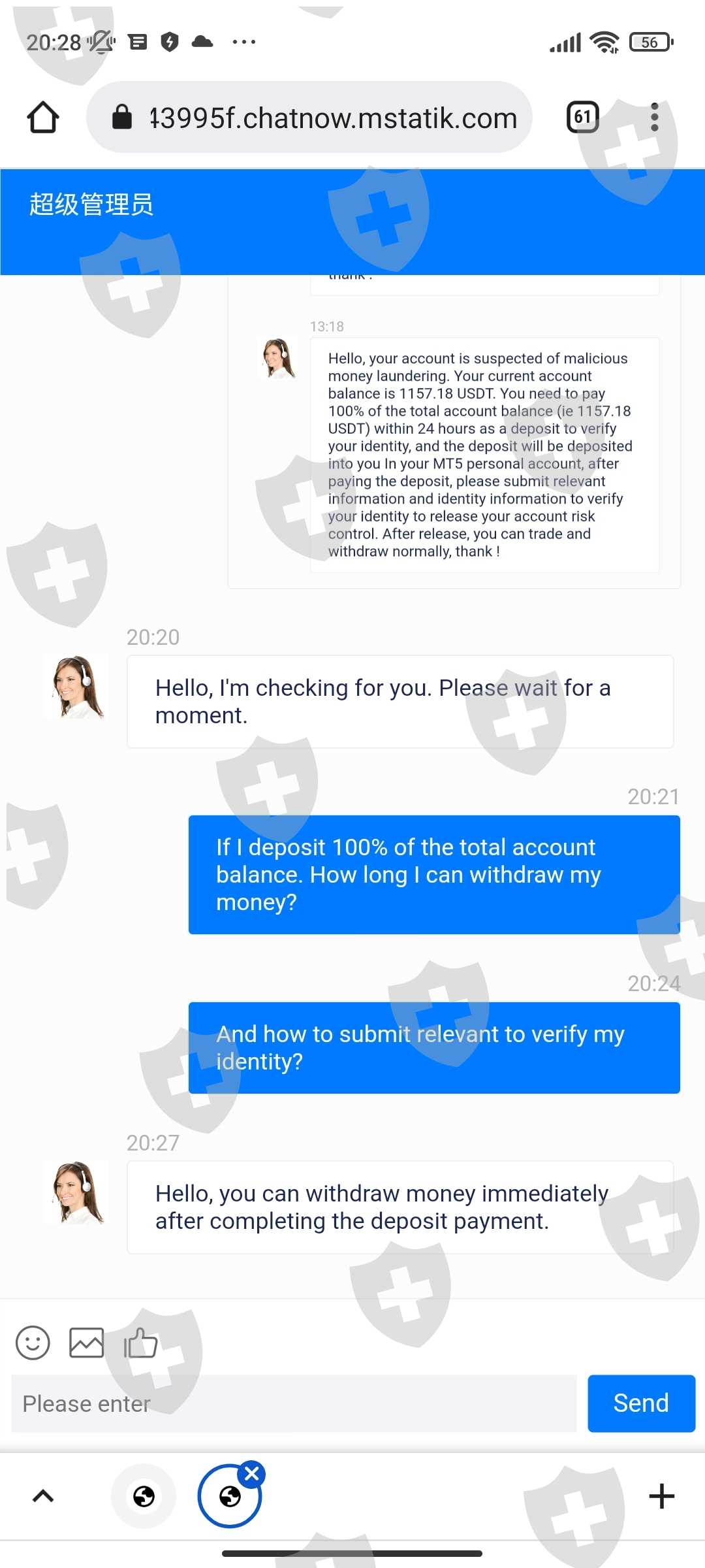 ทำการขอถอนเงินแต่ customer service แจ้งว่าบัญชีเข้าข่ายการฟอกเงินและให้ทำการโอนเงินเข้าไป100%เท่ากับเงินของเราถึงจะถอนเงินออกมาได้ หากไม่โอนเงินภายใน24ชั่วโมงจะต้องมีค่าปรับวันละ3% ได้สอบถามเข้าไปว่ามีหลักฐานการฟอกเงินของเราอย่างไรแต่ระบบได้ทำการลบบัญชีของเราออกไปเรียบร้อยแล้ว ติดต่ออีเมล์เข้าไปไม่มีการตอบรับกลับมาเลย