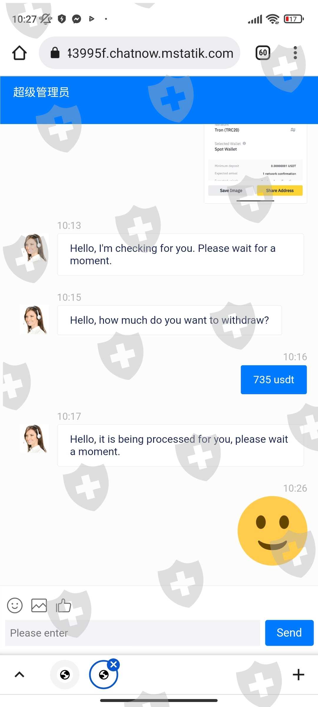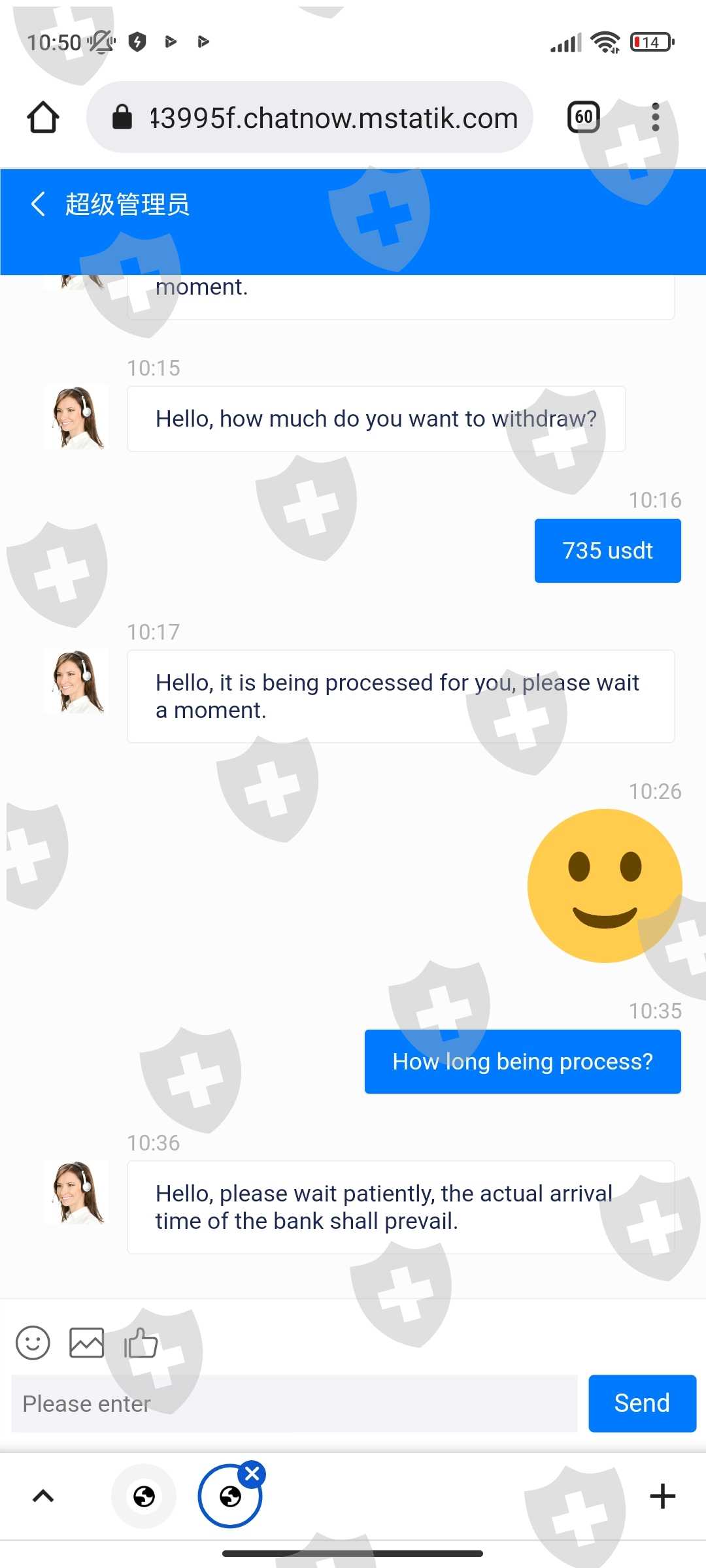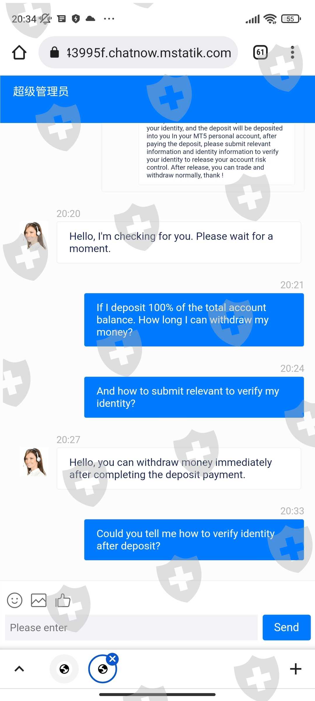 ทำการขอถอนเงินแต่ customer service แจ้งว่าบัญชีเข้าข่ายการฟอกเงินและให้ทำการโอนเงินเข้าไป100%เท่ากับเงินของเราถึงจะถอนเงินออกมาได้ หากไม่โอนเงินภายใน24ชั่วโมงจะต้องมีค่าปรับวันละ3% ได้สอบถามเข้าไปว่ามีหลักฐานการฟอกเงินของเราอย่างไรแต่ระบบได้ทำการลบบัญชีของเราออกไปเรียบร้อยแล้ว ติดต่ออีเมล์เข้าไปไม่มีการตอบรับกลับมาเลย