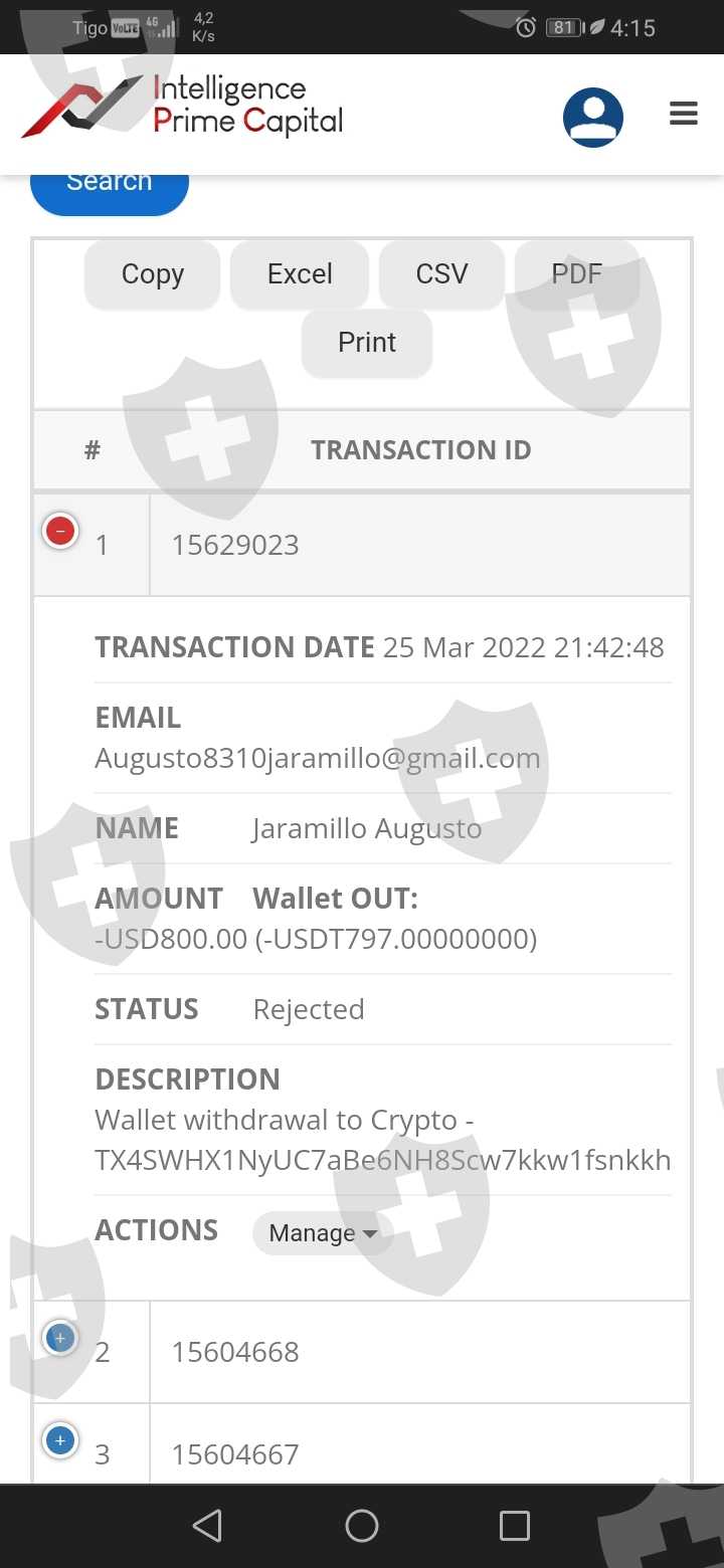 Desde el día 25 de marzo solicité un retiro a mi wallet personal y el retiro fue rechazado... El dinero del retiro no ha sido tampoco devuelto a mi backoficce y no aparece por ninguna parte... Solo en estado rechazado. Adjunto evidencia ya que es preocupante todo lo que sucede en este momento con intelligence prime capital.