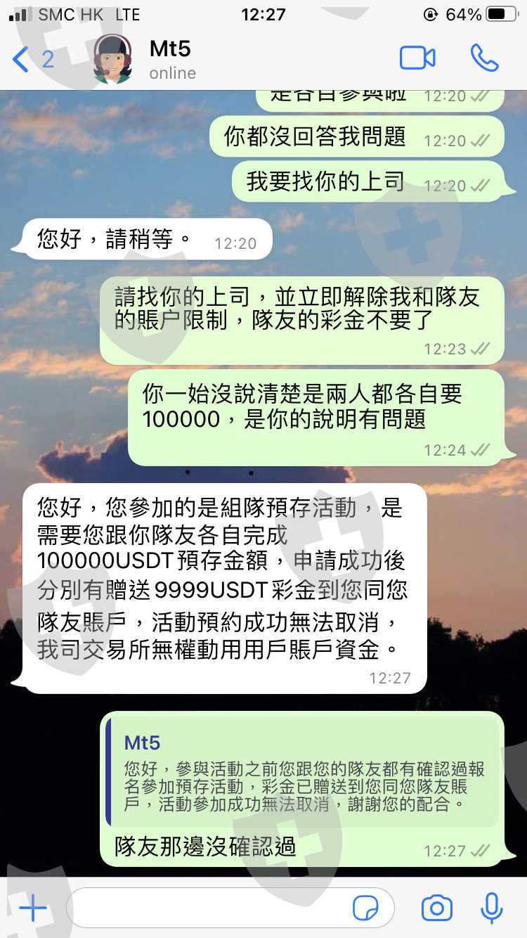 利用交友程式 誘導參與所謂活動,入金10萬美金後,本以為活動完成就能出金。然後以「隊友未完成為活動」為藉口,拒絕出金,所謂隊根本是一顆的,事前完全沒有説明隊友要各自完成活動。入金那些錢是我借貸找來的,被這個行騙集團害慘了,希望天眼能幫忙,即使無法幫忙,也希望警剔別人。