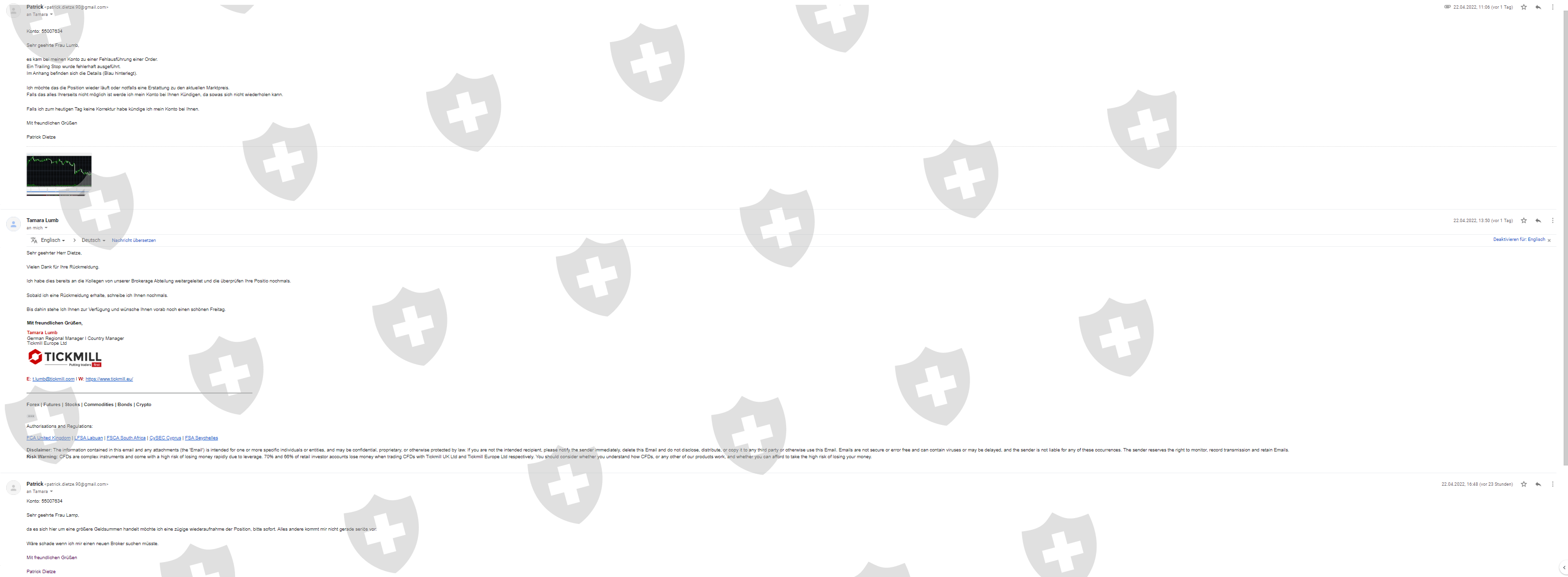 在4月20日之前的正向AUDCAD空头交易之后,4月22日执行了错误的追踪止损(见图)。几个小时后,我报告了这个问题,不幸的是到目前为止没有积极的反馈。造成的损失目前约为600欧元。我已经交易了几年,这种错误模式并不少见,但其他交易商修复了错误的信号 (重置为起始价格)在几分钟内,交易又回到了正轨。股市中的每一分钟都很重要,如此糟糕的客服是对信任的背叛。