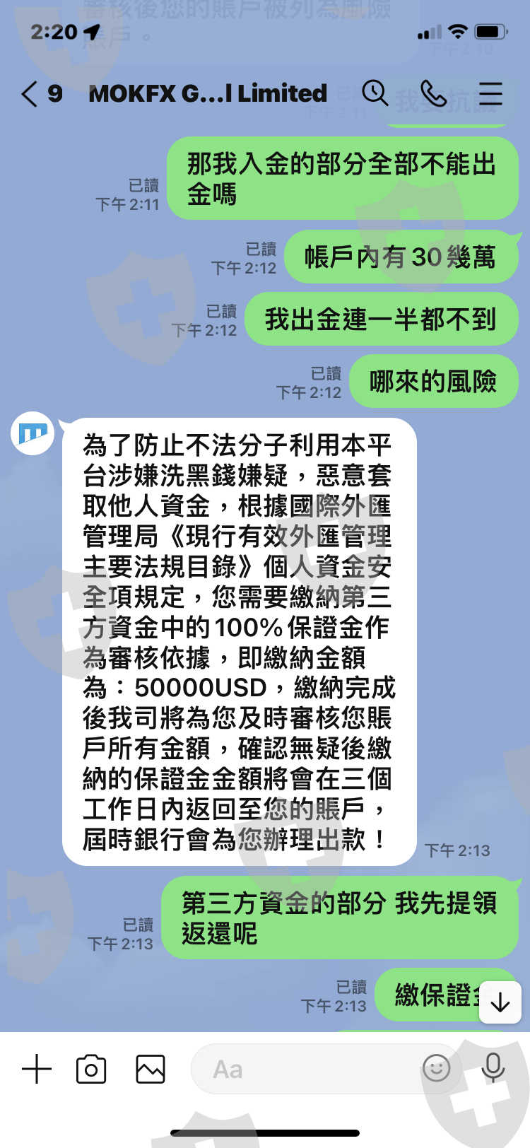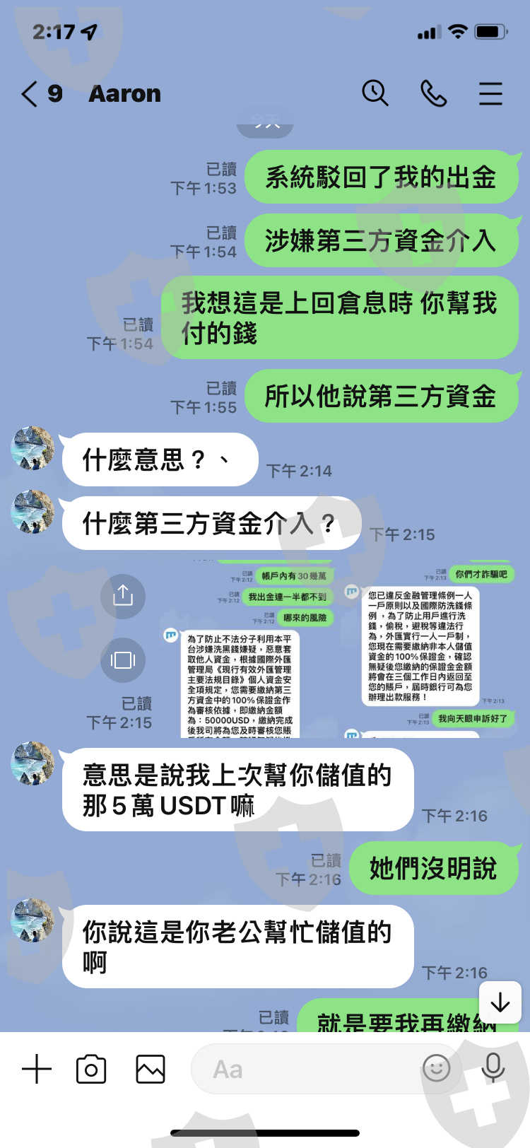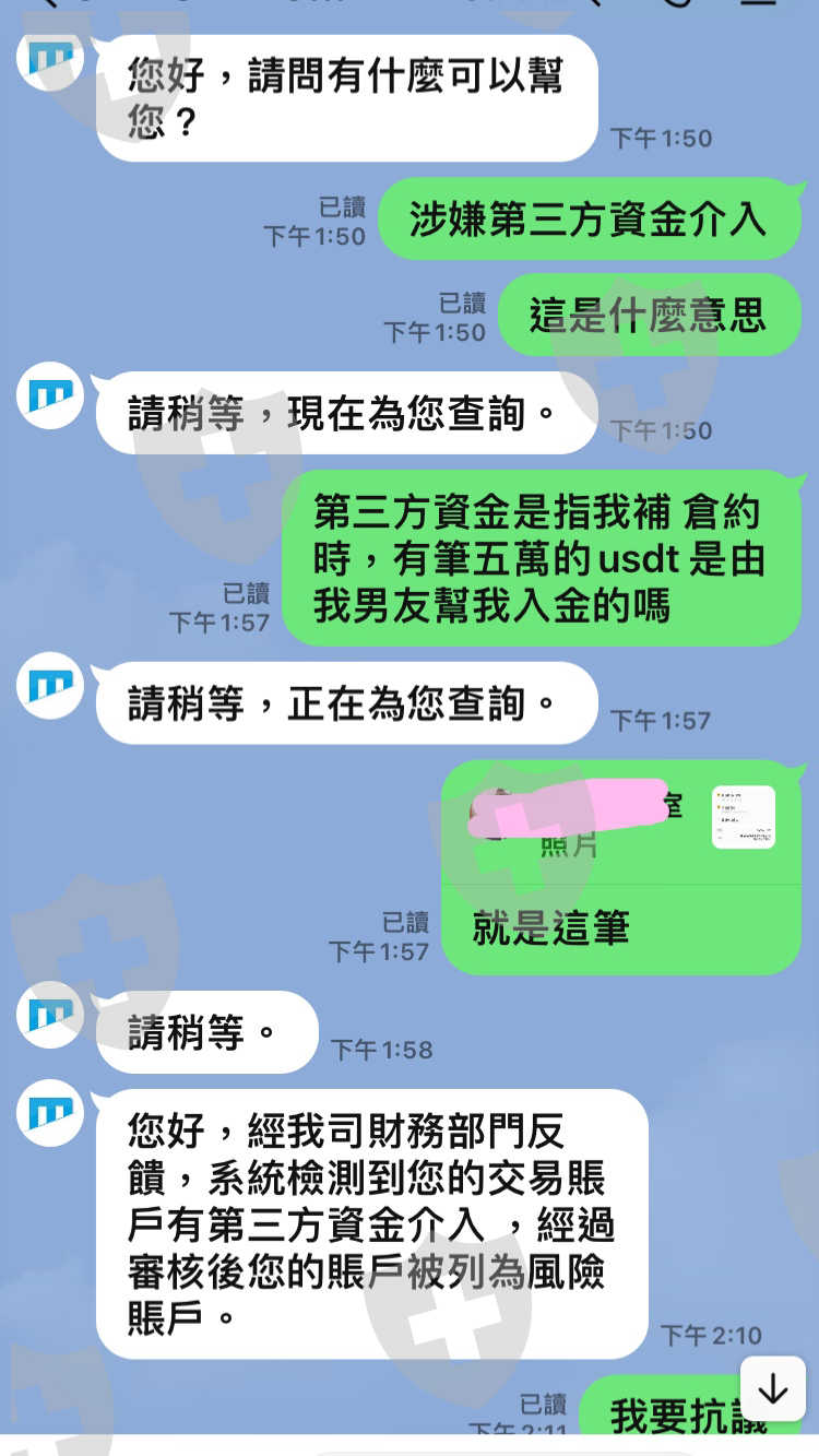 倉約因金額不足,男友有幫忙出資5萬,今有出金需求申請$148888,平台告知有第三方資金介入,不予以出金,且需繳納保證金且需五日內繳納,否則凍結帳戶,並不合理