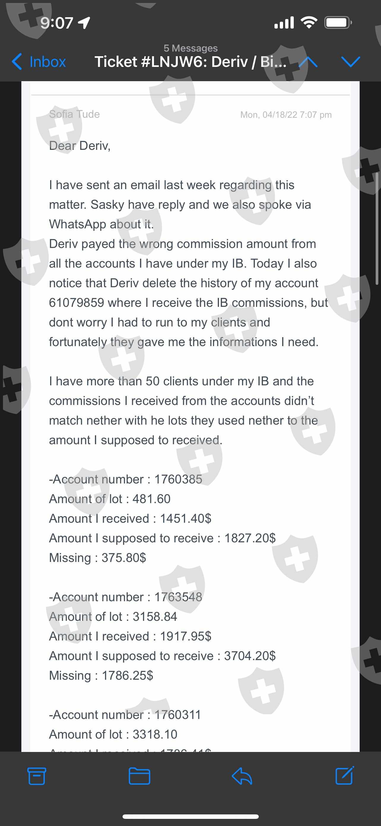 我在Deriv有 50 多个客户,我注意到他们付给我的佣金比他们应该付的少。我联系了我的几个客户,他们给了我他们的账户投资者密码来调查他们有多少手数和交易对。总而言之,我说所有的客户都经营了更多的地段,并产生了更多的佣金,这些佣金支付给了我自己。所以我联系了我的合伙人 ib 经理 sasky,她做了她的研究,其他部门告诉她他们无法分析账户,因为账户已经关闭。好吧,我不得不浪费很多天来搜索客户,向他们索要 myfxbook 上的帐户,或者我可以在哪里看到地段和配对,然后我发送了一封电子邮件,其中包含所有信息,以支持他们的支持、合规性以及艾登(萨斯基告诉我他的电子邮件并说他是负责这件事的部门负责人)。已经过去一个月了,我没有回复。基本上他们多次无视我,因为一周后我联系他们他们进行实时聊天,一次又一次我仍然没有回复。疯了吧。你带来客户,你必须多次上传你的文件 Deriv系统,因为他们一直禁用您的提款。他们只是效率低下且不专业。当您需要帮助时,永远不要回复并且有糟糕的实时聊天代理可用。所以不建议成为 ib 下界交易 Deriv.他们的言辞不可信或不可靠。