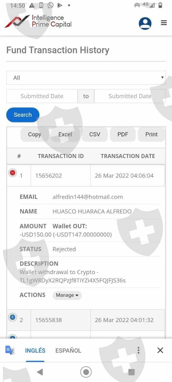 E l 27 de marzo se realizó el retiro de 147 USDT, la cual fue rechazado por la empresa Intelligence Prime Capital, tampoco se reintegro a la billetera de IPC hasta la fecha.