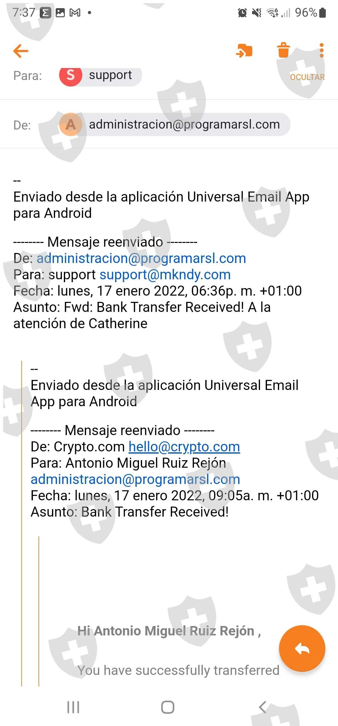 Como ya he expuesto en correos anteriores, dispongo de justificantes de transferencia bancarias a cripto.com y desde ahí mi dinero ca a una dirección wallet de MKNDY y STAREKCO.