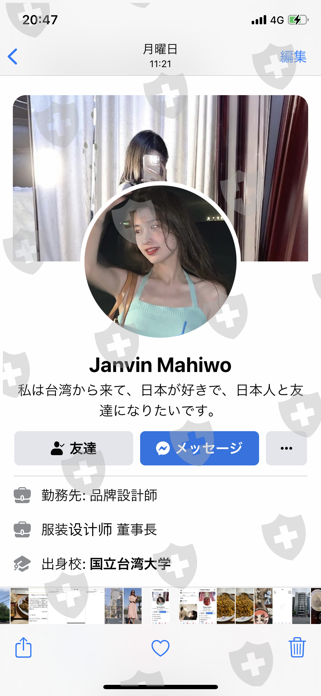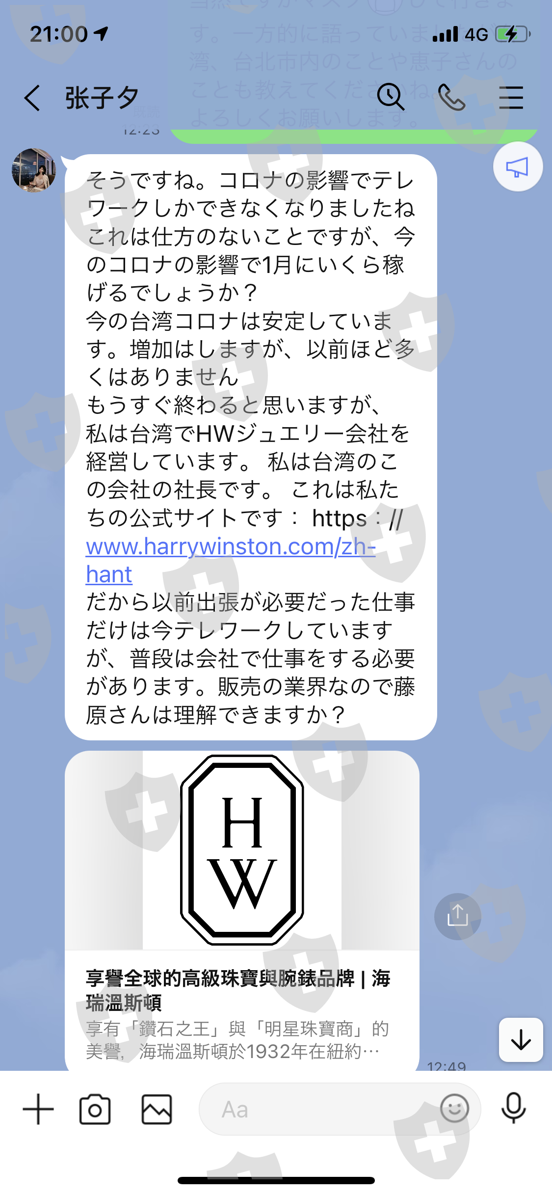 今年の3月初旬に 台湾人Janvin Mahiwo(日本名:野澤恵子)と名乗る人物がFaceBookの友達からLINEへ誘導し、金相場への投資を持ちかけました。「自分は Harry Winston の台湾での支社長」と紹介したうえで、言葉巧みに結婚を匂わせながら追加投資を進め、こちらが国際ロマンス詐欺という言葉を持ち出すと開き直りに日本の著名人の名前を挙げて制裁する等の脅しをかけたり、遂にはカードローンを組むよう誘導したり、更に友人からの借入を要求してくるなど悪質極まりなかったため拒絶したうえで1週間程放置しておきました。