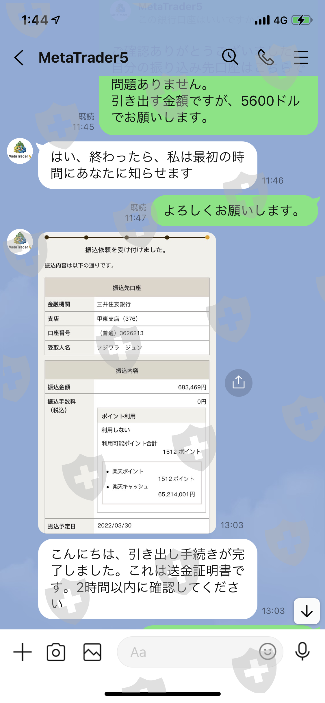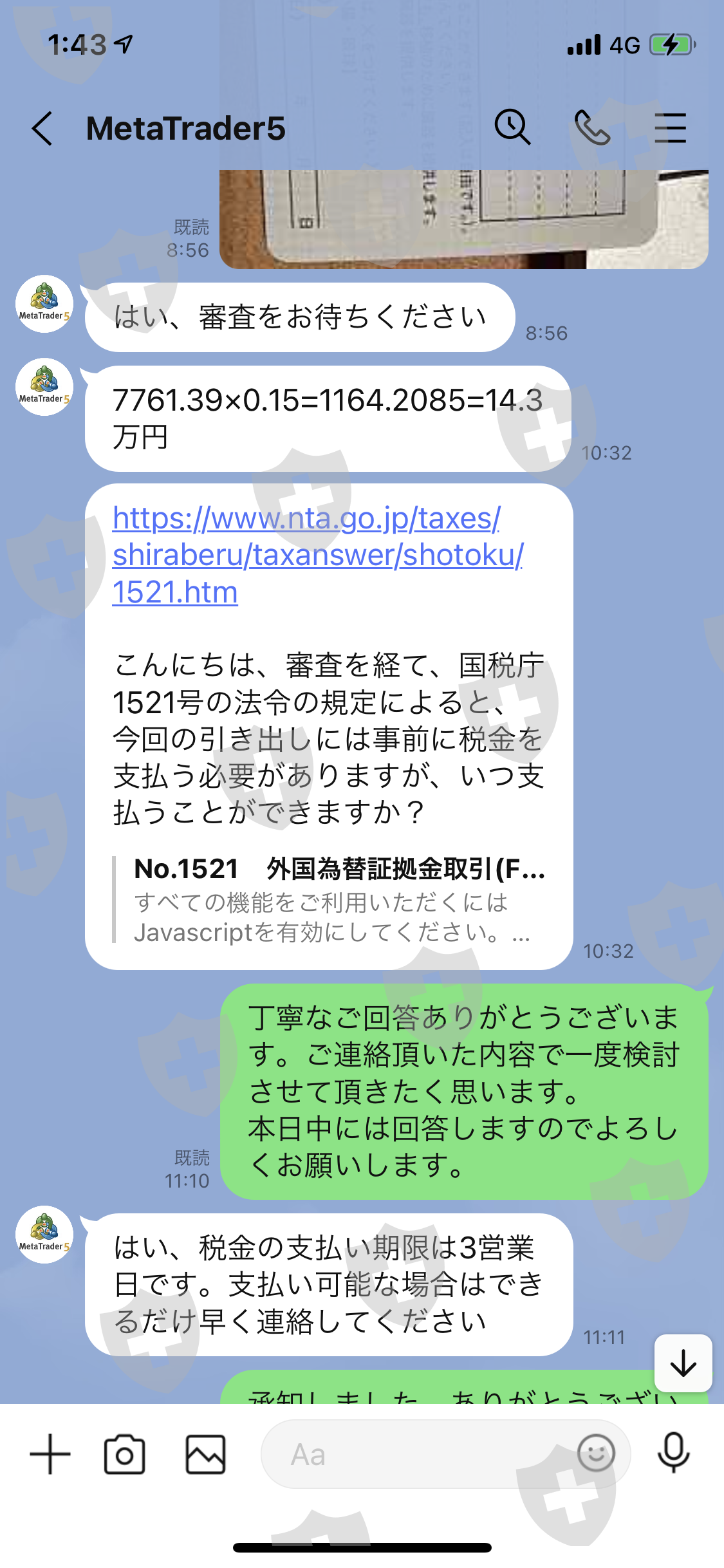 * 有两家 MEDE Global Ltd. 公司,比较混乱,但我写在这里。如果这是一个错误,我很抱歉。今年3月初,一位名叫Janvin Mahiwo(日文名:Keiko Nozawa(泽?))的台湾人将FaceBook的朋友引到LINE,提出投资黄金市场。投资之初,Janvin Mahiwo 提取了价值 100 美元的资金作为“对我的奖励”。当时没有问题,但我尝试通过 3/31 教导的程序从 MEDE Global 的账户中提取 5,800 美元,但该公司的支持要求追加以下资金。.. (1) 支持方要求在 3 个工作日内根据国税厅 1521 缴纳 143,000 日元的税款。 (2)支付(1)后,2小时内有支持方要求确认汇款凭证。