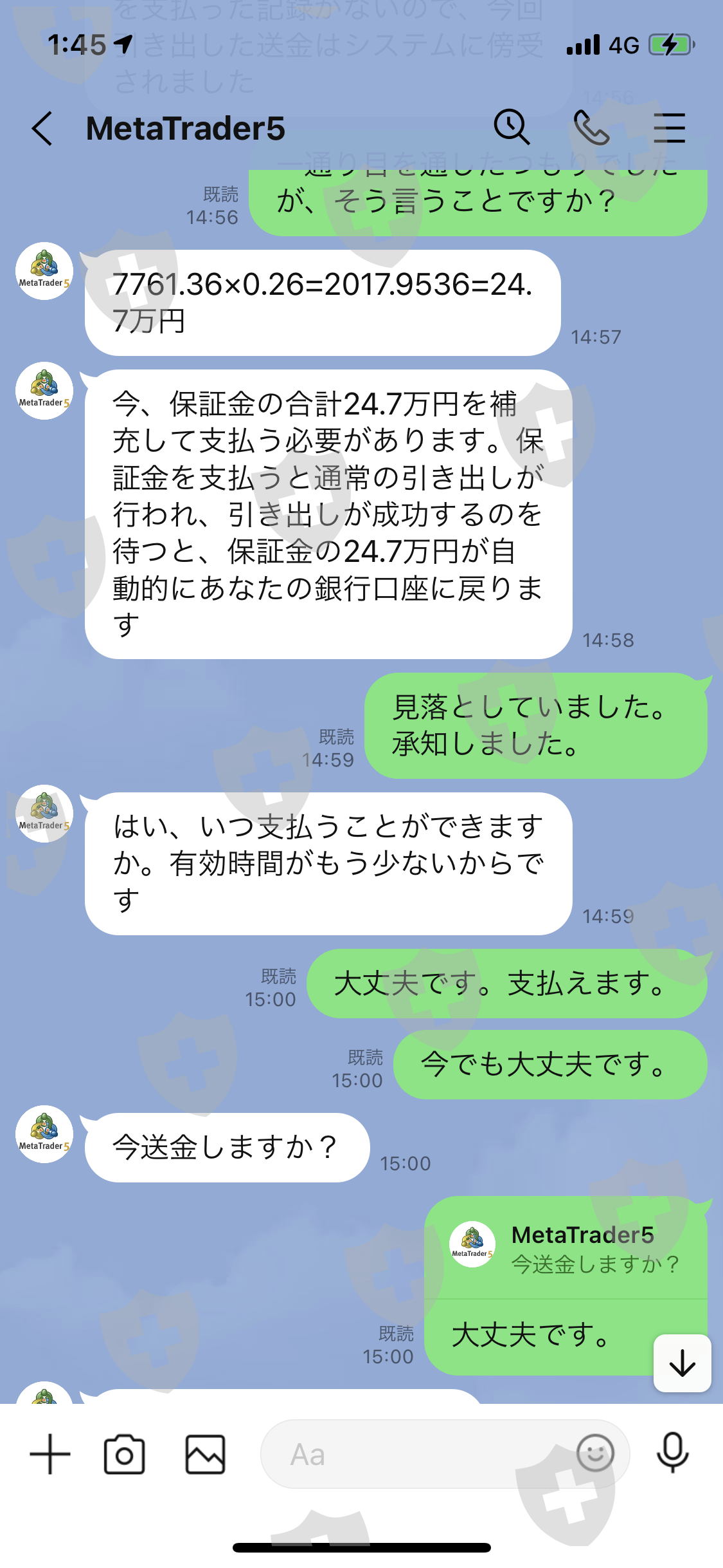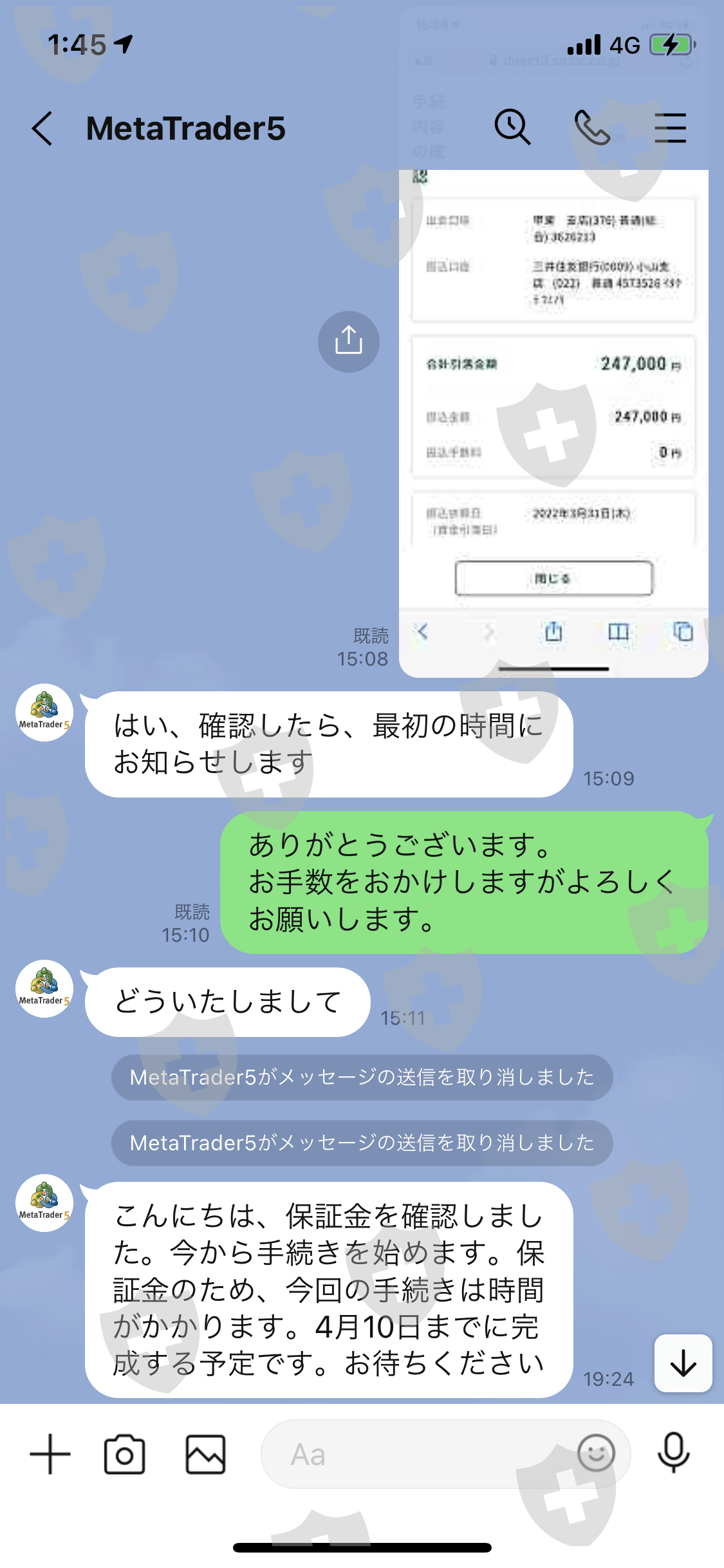 (3) サポート側から確認できなかったことを伝えると受け取り口座内の確認を要求し入金がなかったことを伝えると 今度は国税庁1527を持ち出し、「システムに保証金を支払った記録が無い」との理由で保証金24万7000円を払えと要求する。(4) (3)の支払い後、サポート側から「4/10までに完成する予定」で「終わったら私は最初の時にあなたに知らせます」との連絡あり。 ただし4/10にはサポート側からの連絡は無かった。