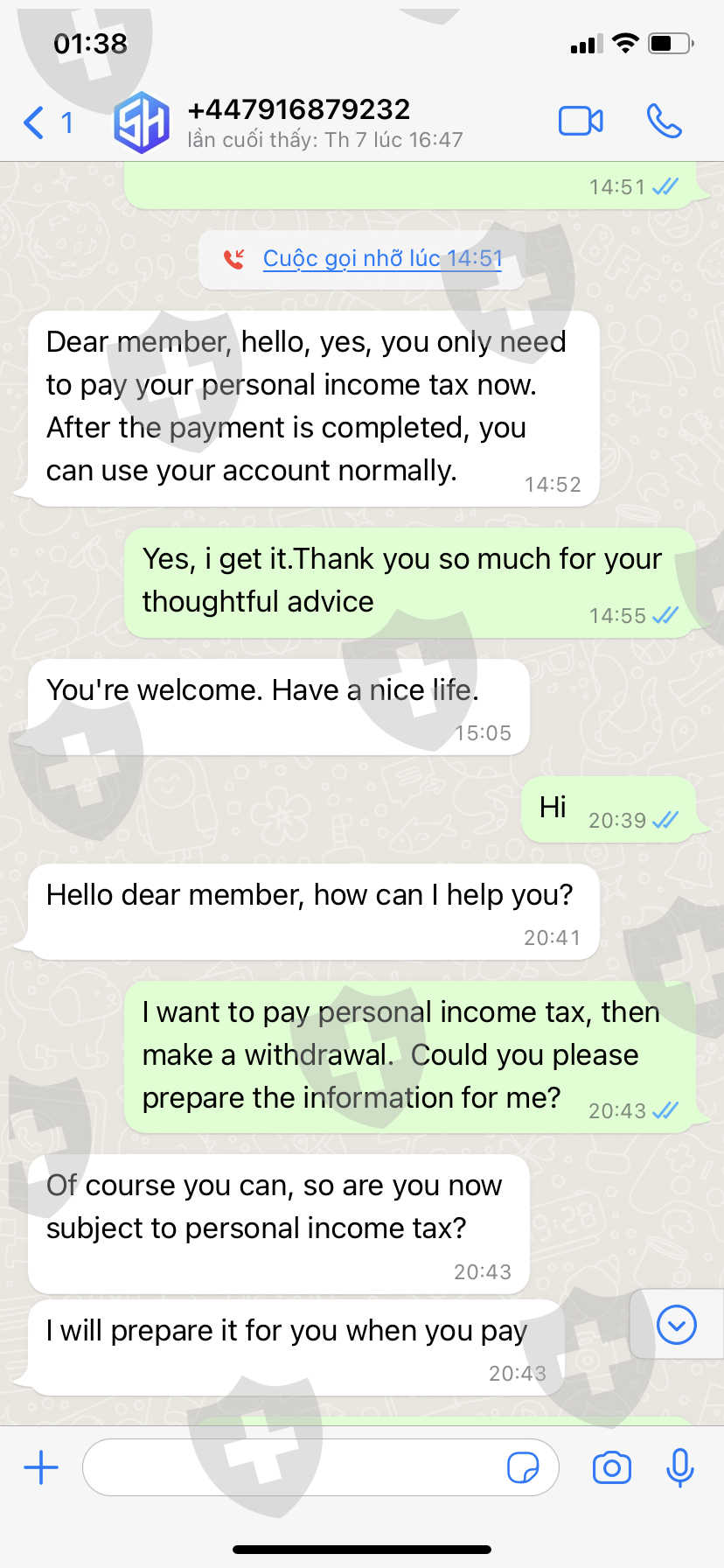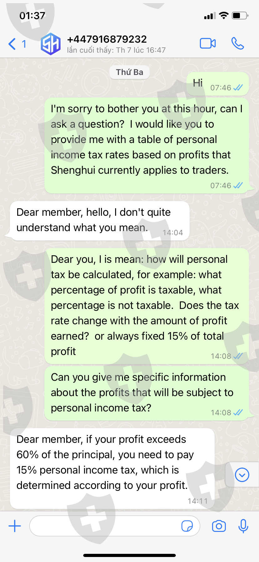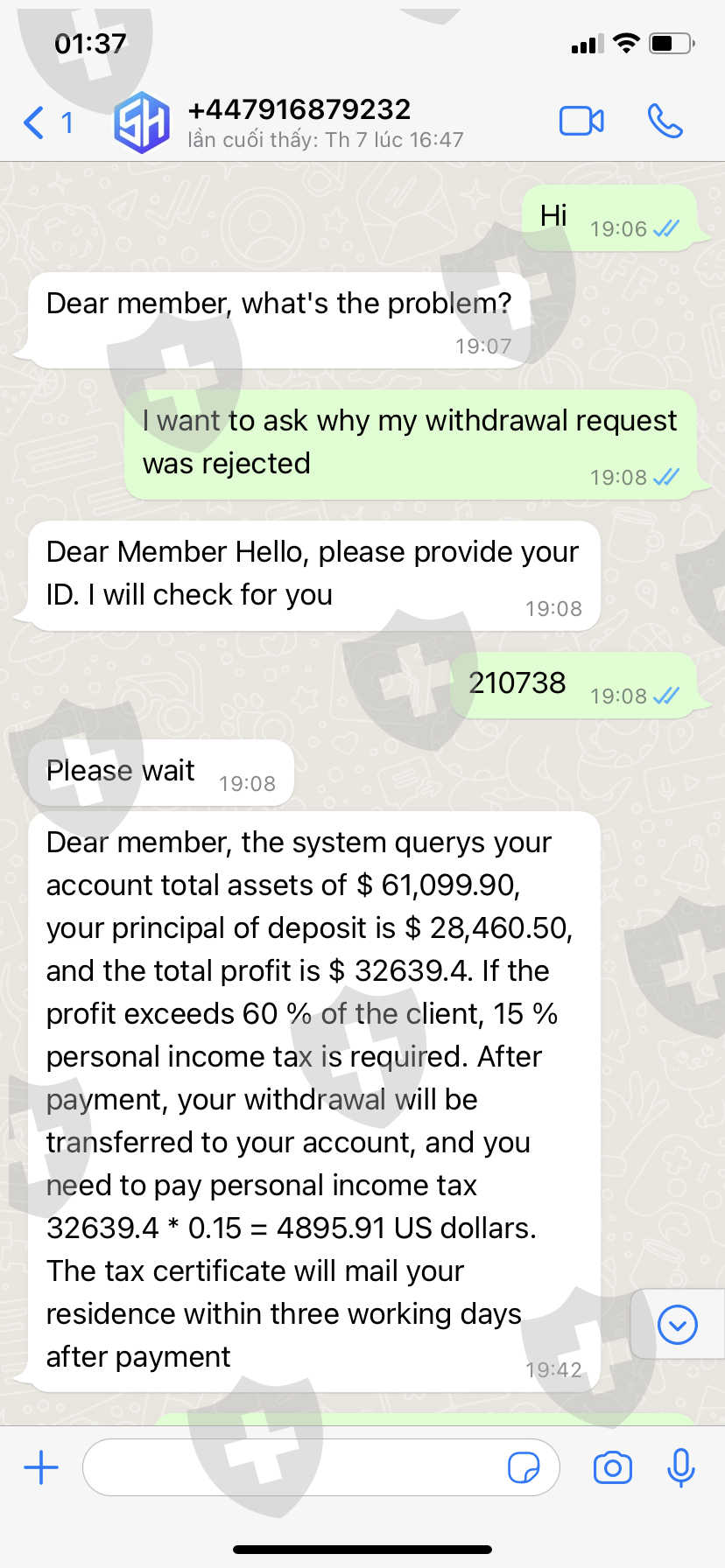 tài khoản của tôi trên shenghuigroupax.com là 210738. sau khi tôi nộp 30.000$ vào tài khoản, và thực hiện giao dịch. sau khi hoàn thành giao dịch, tôi yêu cầu rút toàn bộ số tiền cả gốc lẫn lãi là 61.099.90$. nhưng đơn rút tiền của tôi đã bị từ chối vì lý do phải thanh toán 15% thuế thu nhập cá nhân trên phần lợi nhuận nhận được. mà trước đó tôi không hề thấy sàn đề cập đến vấn để thuế phải trả cho phần lợi nhuận này trong các văn bản nào khi thực hiện đăng ký tài khoản. tôi đã thanh toán 20% số thuế thu nhập cá nhân và mong muốn sẽ rút được phần tiền tương ứng với số thuế đã đóng, nhưng họ từ chối và yêu cầu tôi phải thanh toán toàn bộ số thuế trước khi có thể rút tiền. họ luôn yêu cầu phải đóng tiền để có thể rút tiền của tôi, kể cả là rút phần tiền gốc đã gửi chứ không kể phần lợi nhuận họ đều từ chối, nếu tôi không đóng thuế sau kì nghỉ lễ họ sẽ đóng băng vĩnh viễn tài khoản của tôi, mặc dù tôi không hề vi phạm bất kì điều luật nào. tiền tôi chưa được rút, thuế cũng đã đóng một nửa, nhưng họ lại yêu cầu sẽ đóng băng tài khoản của tôi một cách vĩnh viễn không vì bất kì lí do vi phạm nào. tôi có thể sẵn sàng trả thuế để rút tiền của mình về, nhưng điều gì chắc chắn cho tôi là tôi sẽ không phải trả thêm bất kì một loại phí nào khác ngoài thuế để có thể rút tiền . hay sau khi đóng thuế tôi lại phải đóng thêm vô số các khoản phí khác nhưng vẫn không thể rút được tiền. tôi thực sự nghi ngờ về tính minh bạch của Shenghuigroupax.com. sàn đang cố tình scam tiền của nhà đầu tư và thu mọi loại phí có thể.