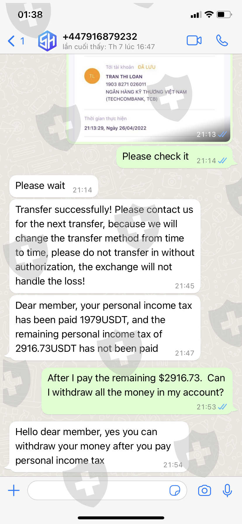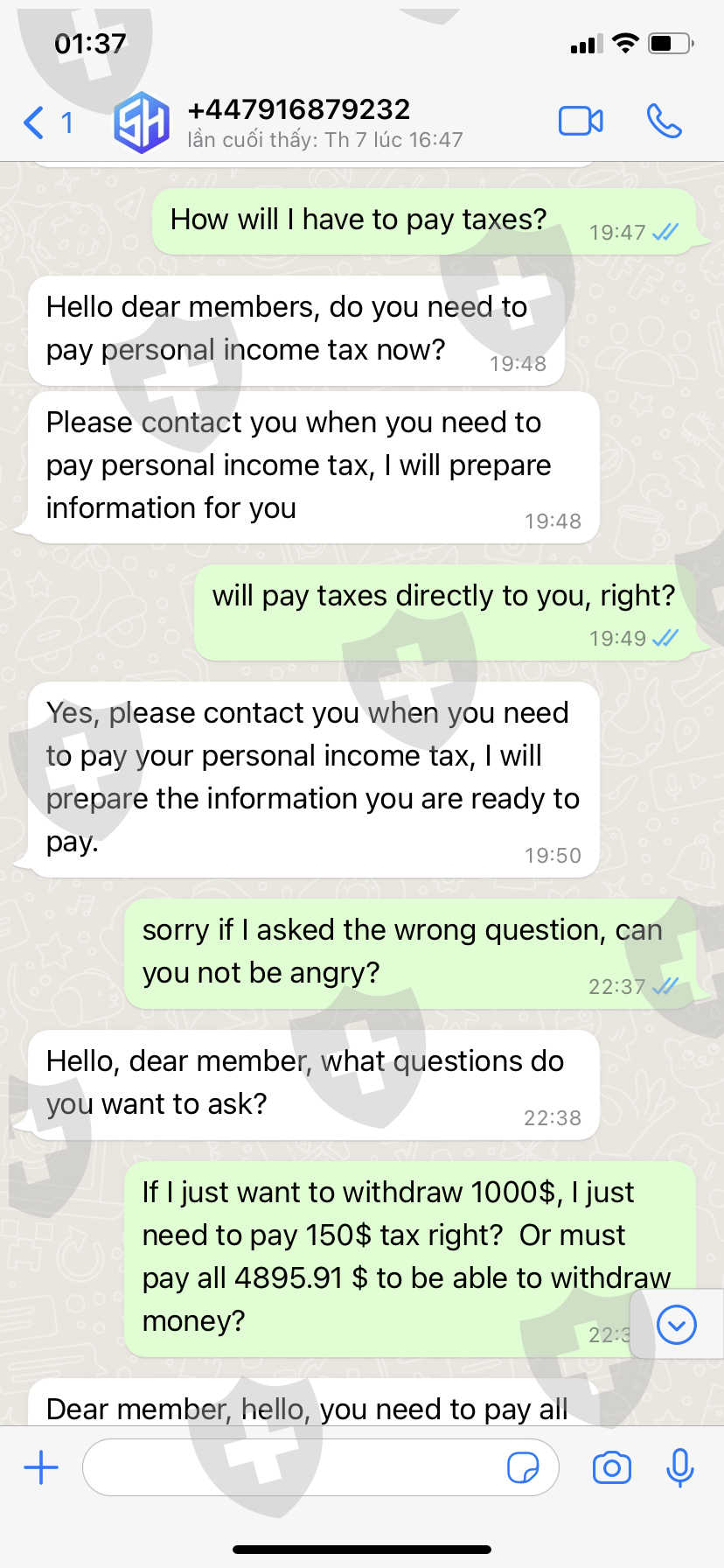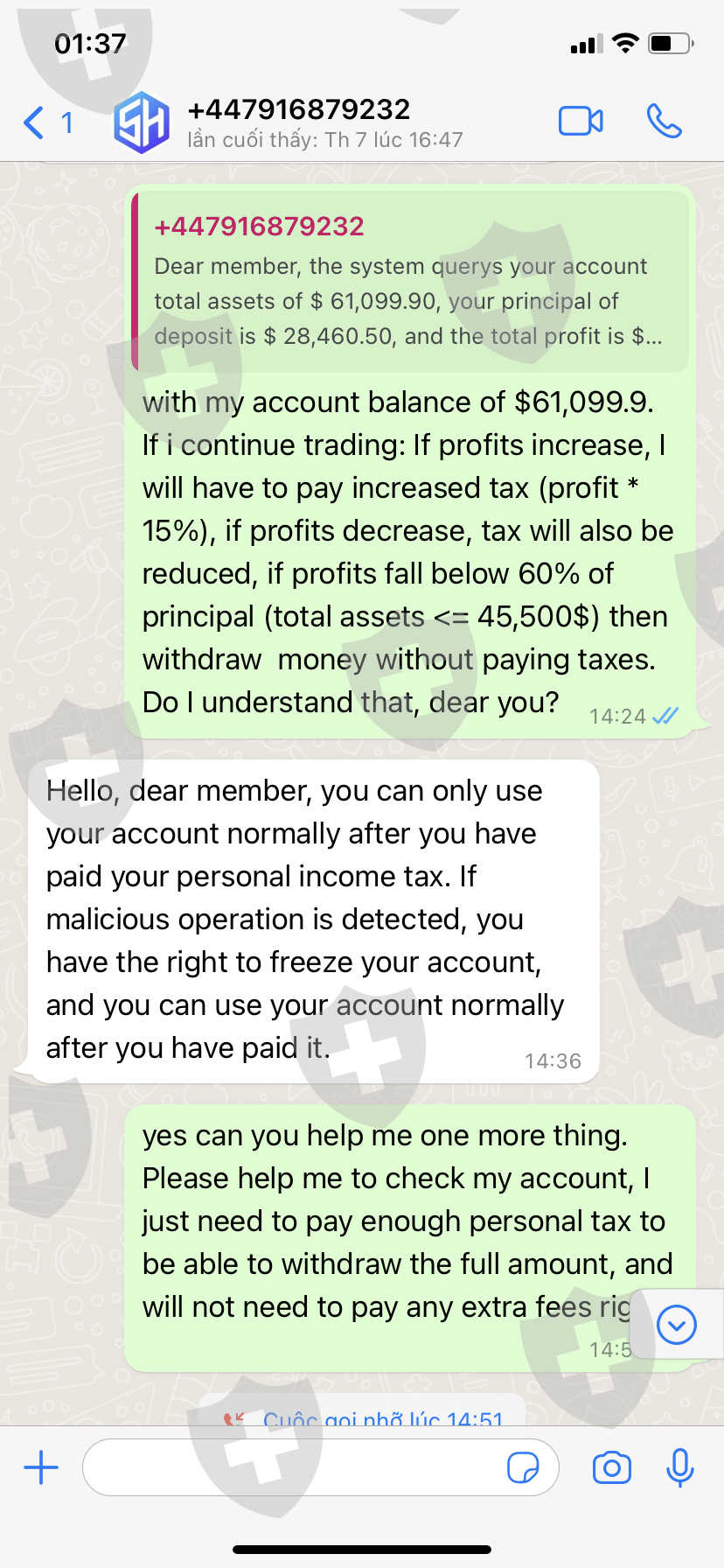tài khoản của tôi trên shenghuigroupax.com là 210738. sau khi tôi nộp 30.000$ vào tài khoản, và thực hiện giao dịch. sau khi hoàn thành giao dịch, tôi yêu cầu rút toàn bộ số tiền cả gốc lẫn lãi là 61.099.90$. nhưng đơn rút tiền của tôi đã bị từ chối vì lý do phải thanh toán 15% thuế thu nhập cá nhân trên phần lợi nhuận nhận được. mà trước đó tôi không hề thấy sàn đề cập đến vấn để thuế phải trả cho phần lợi nhuận này trong các văn bản nào khi thực hiện đăng ký tài khoản. tôi đã thanh toán 20% số thuế thu nhập cá nhân và mong muốn sẽ rút được phần tiền tương ứng với số thuế đã đóng, nhưng họ từ chối và yêu cầu tôi phải thanh toán toàn bộ số thuế trước khi có thể rút tiền. họ luôn yêu cầu phải đóng tiền để có thể rút tiền của tôi, kể cả là rút phần tiền gốc đã gửi chứ không kể phần lợi nhuận họ đều từ chối, nếu tôi không đóng thuế sau kì nghỉ lễ họ sẽ đóng băng vĩnh viễn tài khoản của tôi, mặc dù tôi không hề vi phạm bất kì điều luật nào. tiền tôi chưa được rút, thuế cũng đã đóng một nửa, nhưng họ lại yêu cầu sẽ đóng băng tài khoản của tôi một cách vĩnh viễn không vì bất kì lí do vi phạm nào. tôi có thể sẵn sàng trả thuế để rút tiền của mình về, nhưng điều gì chắc chắn cho tôi là tôi sẽ không phải trả thêm bất kì một loại phí nào khác ngoài thuế để có thể rút tiền . hay sau khi đóng thuế tôi lại phải đóng thêm vô số các khoản phí khác nhưng vẫn không thể rút được tiền. tôi thực sự nghi ngờ về tính minh bạch của Shenghuigroupax.com. sàn đang cố tình scam tiền của nhà đầu tư và thu mọi loại phí có thể.