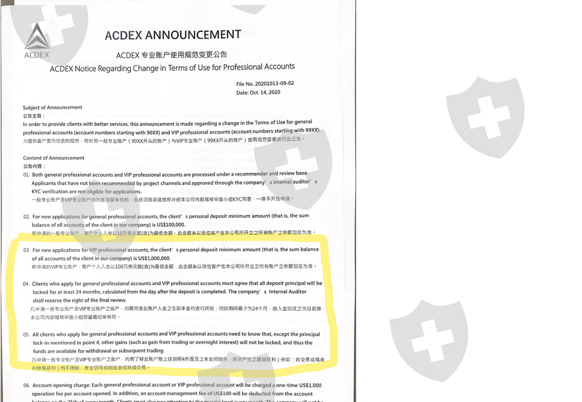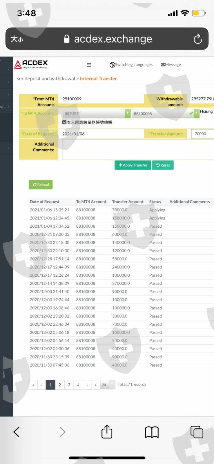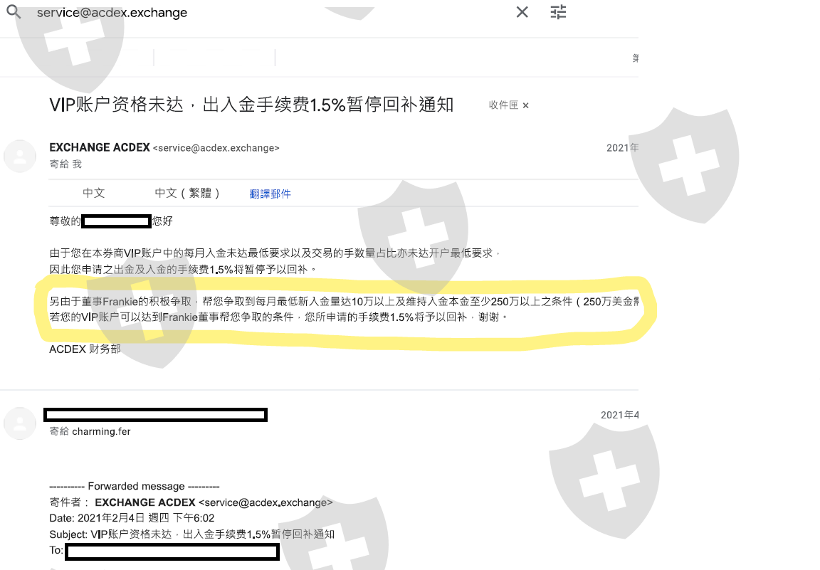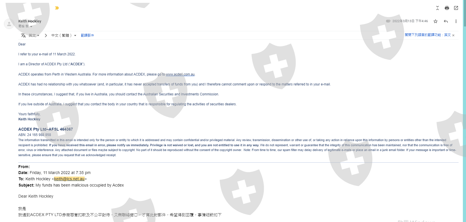 內容:這個券商兩年前我就用過,當時看他有ASIC牌照才用的,並且有跟朋友一起辦了他們的VIP帳戶,要一百萬美金才能辦,結果用了一陣子竟然不給出金,原因是說VIP帳戶門檻調高,當時想說這券商非常有問題,根本就資金盤吧,所以當時2021年2月果斷決定要把帳戶關掉並出清所有資金,但重點來了,這個券商用了一堆奇怪的理由沒退還所有資金,至少扣了20%以上違約金,開戶時寫規則一百萬美金,然後沒說會調高門檻,也沒寫說關帳戶會有懲罰性扣款, 後來我個人的部分依照我們VIP帳戶的比例我應該要收到61915美金券商還硬要分兩次給錢,第一筆在2021/5給了我第一筆39626.22美金,並且在MAIL裡寫說我們收到第一筆後回覆跟他們確認收到第一筆才會給第二筆,重點是,要全部的人(共約60人)都回覆給他們才願意發第二筆,當時2021/6前我們就全部都回覆了,結果!!他們竟然把跟我們往來的聯絡信箱刪除!!(如附件照片是我寄給他們,但根本不存在此信箱)然後我也不知道怎樣拖到今年年初,才把第二筆5059美金退給我,但跟我們當初關帳戶我的金資還差了一萬七千多美金!!! 後來決定直接發信給這家券商持牌人Keith Hockley,券商持牌人的回覆說,ACDEX沒有接收過我任何資金你有問題找你自己國家的金融單位去講,我這邊只管澳洲的(以上是我已經翻譯過的大意,原文我放在附件),我後來把我們入金帳戶的所有資訊都提供給他,並且問他這不就是你的券商ACDEX?他直接回覆我不是他的ACDEX(如附件)
