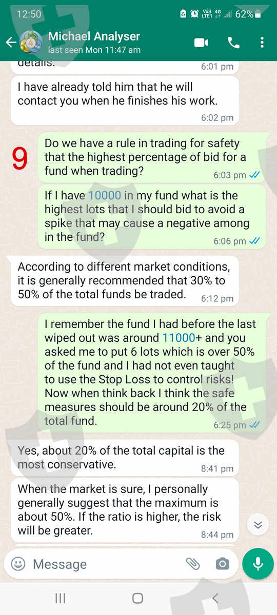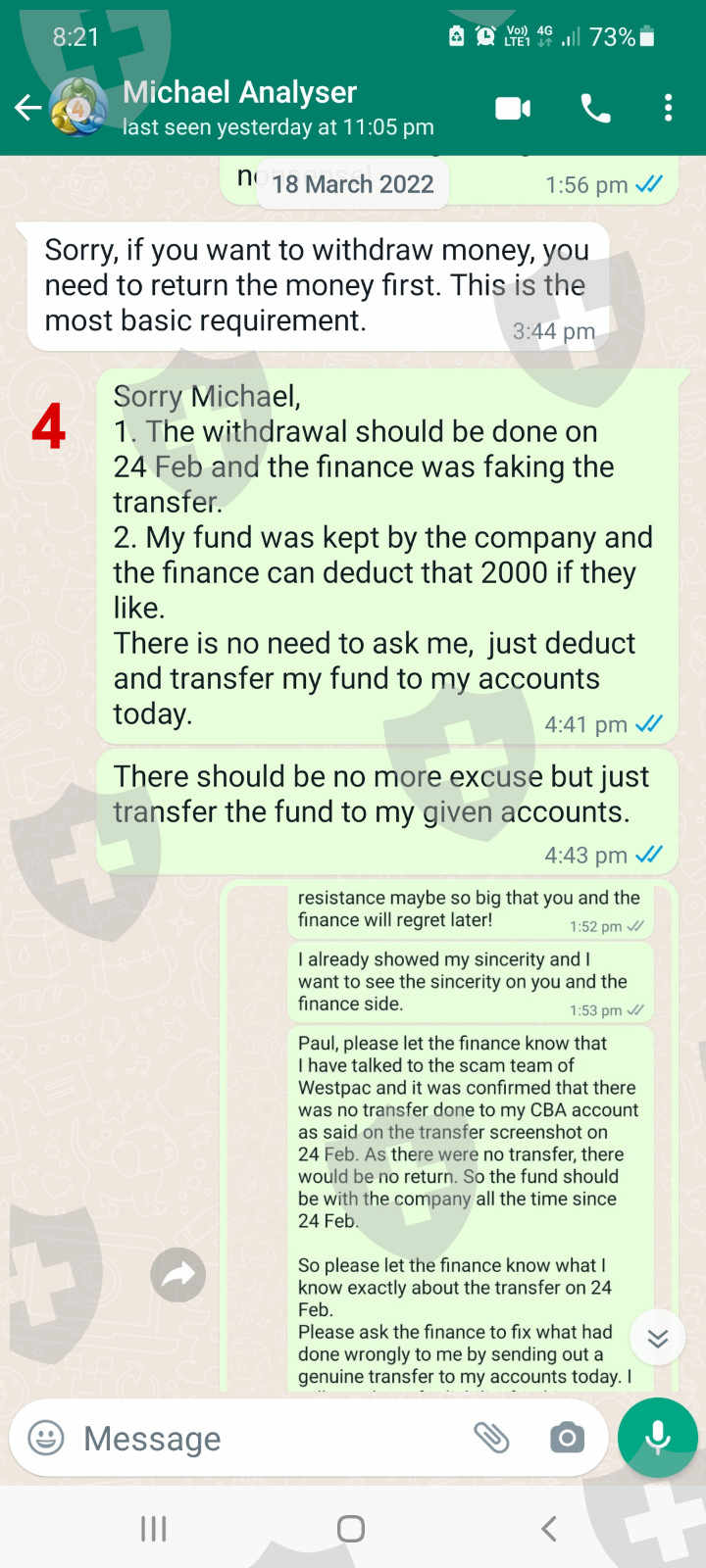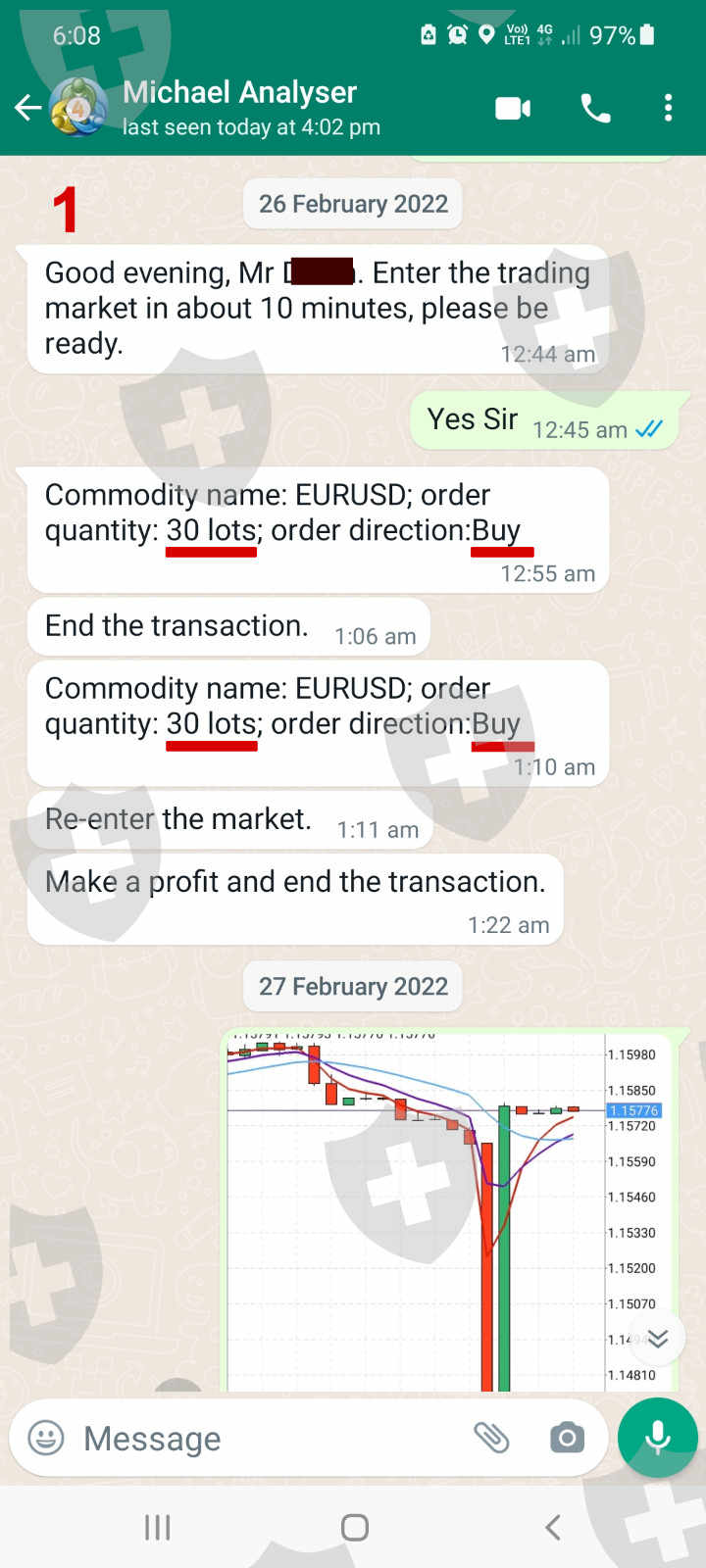 照片 1、1a:分析师迈克尔在2022年2月25日星期五晚上给出的指示照片 1a:在飙升之后,我通过将 Skyam Invest 的图表与其他 2 个没有长钉。在飙升之下,没有大的成交量支撑市场的波动。这些是操纵和诈骗的证据。照片 2:迈克尔自 2022 年 2 月 27 日以来一直保持沉默照片 3:表明迈克尔知道发生了什么事照片 4:“......如果你想取款,你需要先把钱还回来......”所以这是将我的账户炸毁为负值 -2749.50 的目的。照片 5:迈克尔负责:没有给出止损。照片 6:迈克尔第一次炸毁我的账户是在 2021 年 11 月 18 日。照片 7 和 8: 2021年11月18日,迈克尔的指令也没有止损图9:谁敢听从分析师的指令交易?综上所述,15年的分析师迈克尔没有风险管理。他是向客户指示赢与输的人。这些骗局都是策划好的!他会拿走 8% 的利润,但不会支付你 8% 的损失。如果没有分析师的参与,服务器操作将无法成功。Skyam Invest 必须赔偿我 127,000 美元,因为我在 2022 年 2 月 25 日与分析师的同伙一起进行了不公平的 MT4 服务器操作。