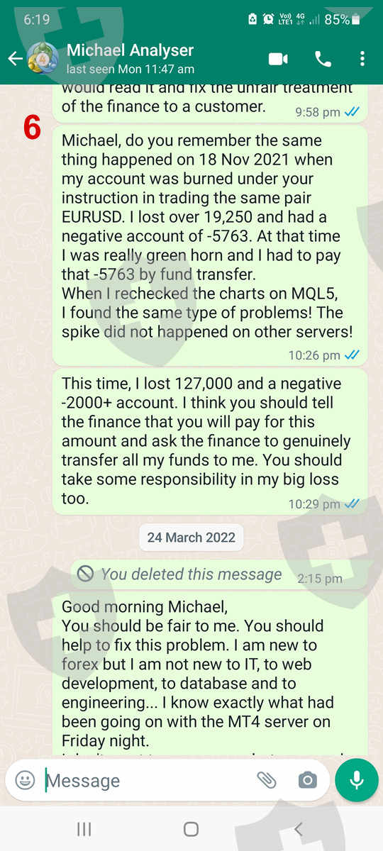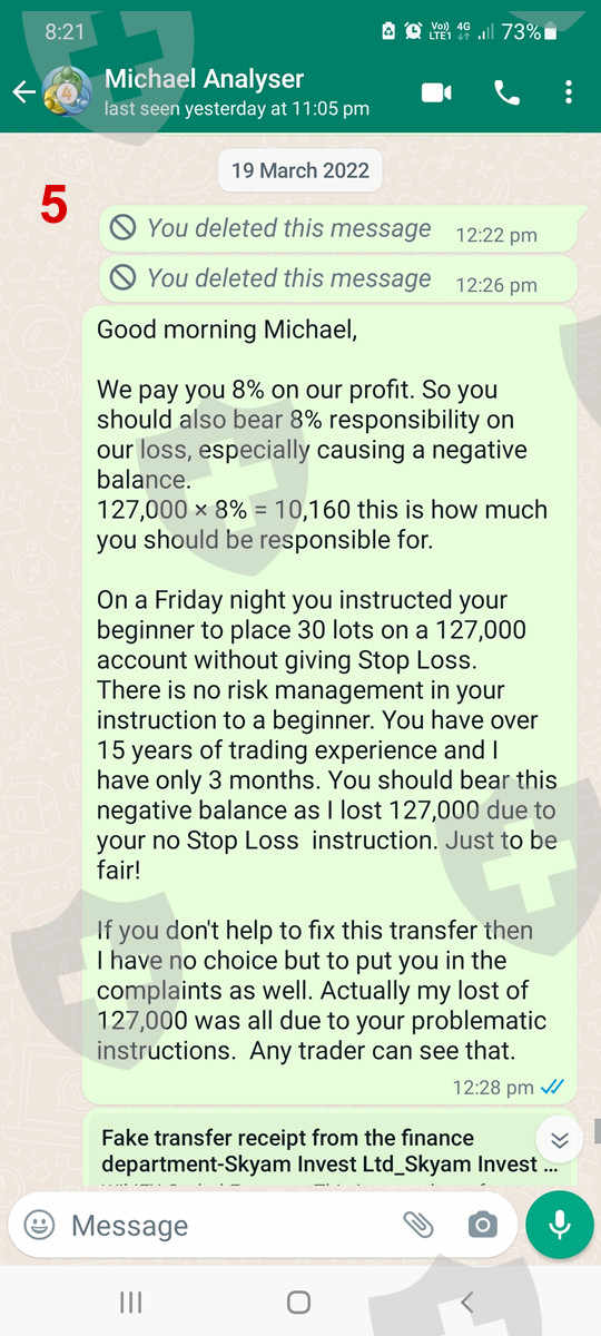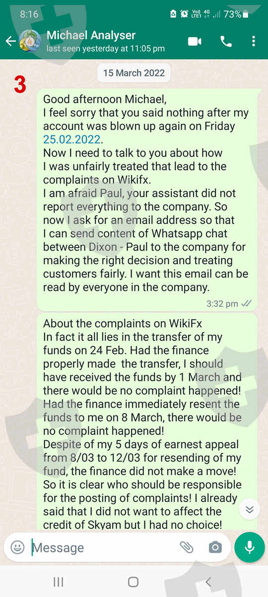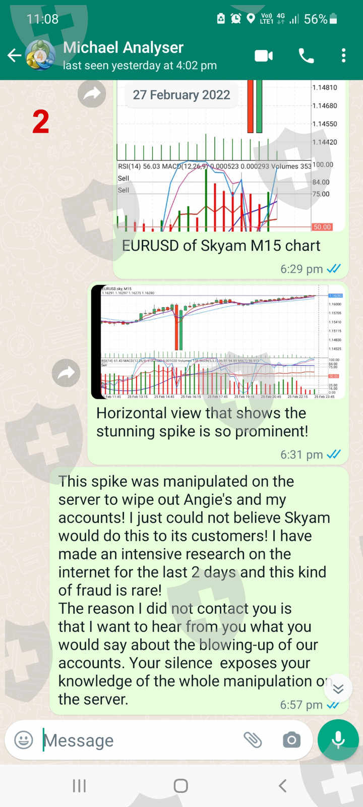 Photo 1, 1a: Instruction given by Michael, the analyst on Friday night 25 Feb 2022Photo 1a: Right after the spike, I showed Michael the evidence of manipulation by comparing the charts of Skyam Invest with charts from 2 other platforms that did not have the spike. Under the spike there was no big volume that supported the fluctuation of the market. These are evidences of manipulation and scams.Photo 2: Michael kept silent since 27 Feb 2022Photo 3: Shows Michael knew what had happenedPhoto 4: "...if you want to withdraw money you need to return the money first..." So this is the purpose to blow up my account to a negative -2749.50.Photo 5: Michael is responsible for: no stop loss given.Photo 6: The first time Michael blew up my account was on 18 Nov 2021.Photo 7 and 8: on 18 Nov 2021, Michael’s instructions also had no stop lossPhoto 9: Who would dare to follow the instructions of this analyst to trade?To sum up, Michael, the 15 year analyst does not have risk management. He is the person who gives customers instructions to win and to lose all. These scams were all plotted! He would take 8% of the profit but not pay 8% of your loss. The server manipulation could not be successful if there is no participation of the analyst.Skyam Invest must compensate me 127,000 USD for the unfair MT4 server manipulation with the accomplice of the analyst on 25 Feb 2022.