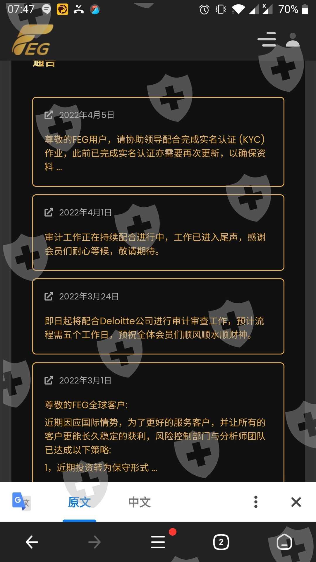 从2022年3月21号开始,提现就不到账了,好多人反映后,24号公司才发出来通知接受审计了,就一拖再拖,现在又是kyc认证,又快一个月过去了,说材料交到英国经管局去了,叫我们老老实实在家等着,FEG一定会回来的!近期发现券商的官网早已经打不开了,也找不到任何券商的客服人员,也就是给我们管钱的公司已经失联, 后经专业人士查询得知,所有的证件监管号都是假的,还说是英国国际金融集团顶尖的公司,现在只剩下一个分润系统可登录,能看到一堆迷人的数字,不知道这上百万的投资款找谁讨回,现在只能联系推荐的老师,也是电话不接,微信不回,直接玩失踪了!更可恨之处,竟然还有很多投资者认为这才是真金融,该醒醒了,被骗都是认知缺陷。