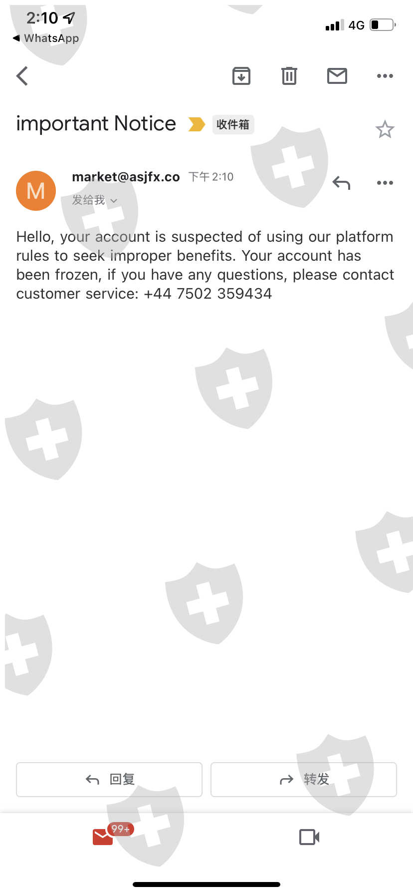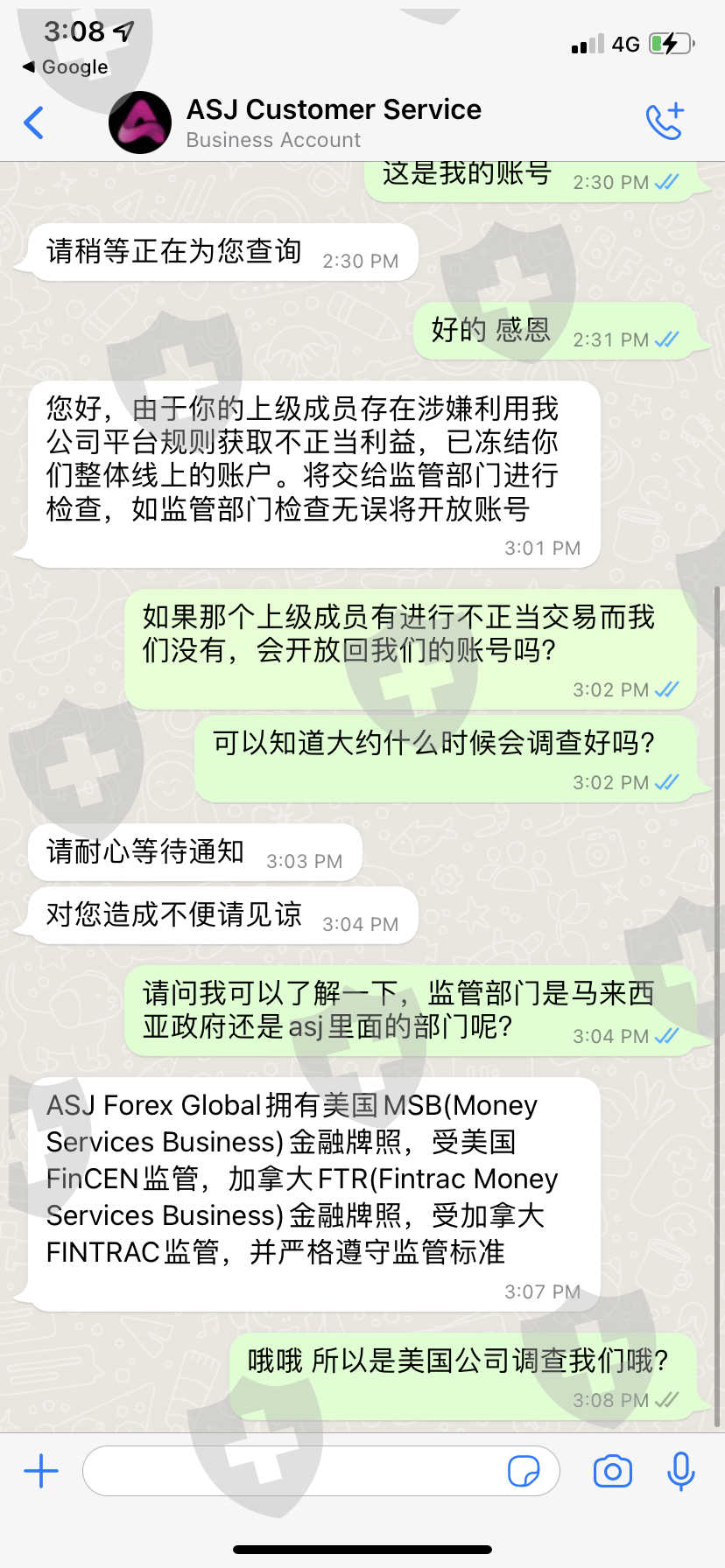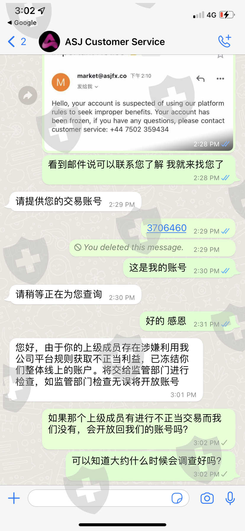 ASJ 这个公司突然在4/5/2022暂停了我的账号,使我不能交易不能登录ASJ账号了,里面的资金也因此被冻结不能出金,这很不寻常..它发来的邮件是说我的账号有用来谋取不正当的交易,事实是没有,我都是在正常交易,而且不止我一个遇到这个状况,连通我的下线我的上线通通都被封锁了,询问客服给我的理由是“您好,由于你的上级成员存在涉嫌利用我公司平台规则获取不正当利益,已冻结你们整体线上的账户。将交给监管部门进行检查,如监管部门检查无误将开放账号” 可是却给不出一个确切的期限什么时候会查好,而且上级成员出问题为什么要连通无辜的我们都要被封锁呢我不明白,请帮忙申诉我的账号被冻结的问题…我的账号是3706460