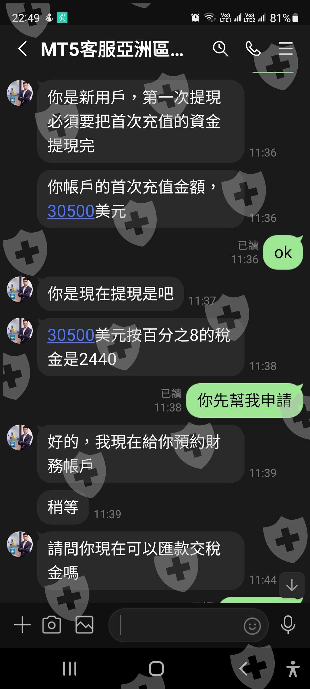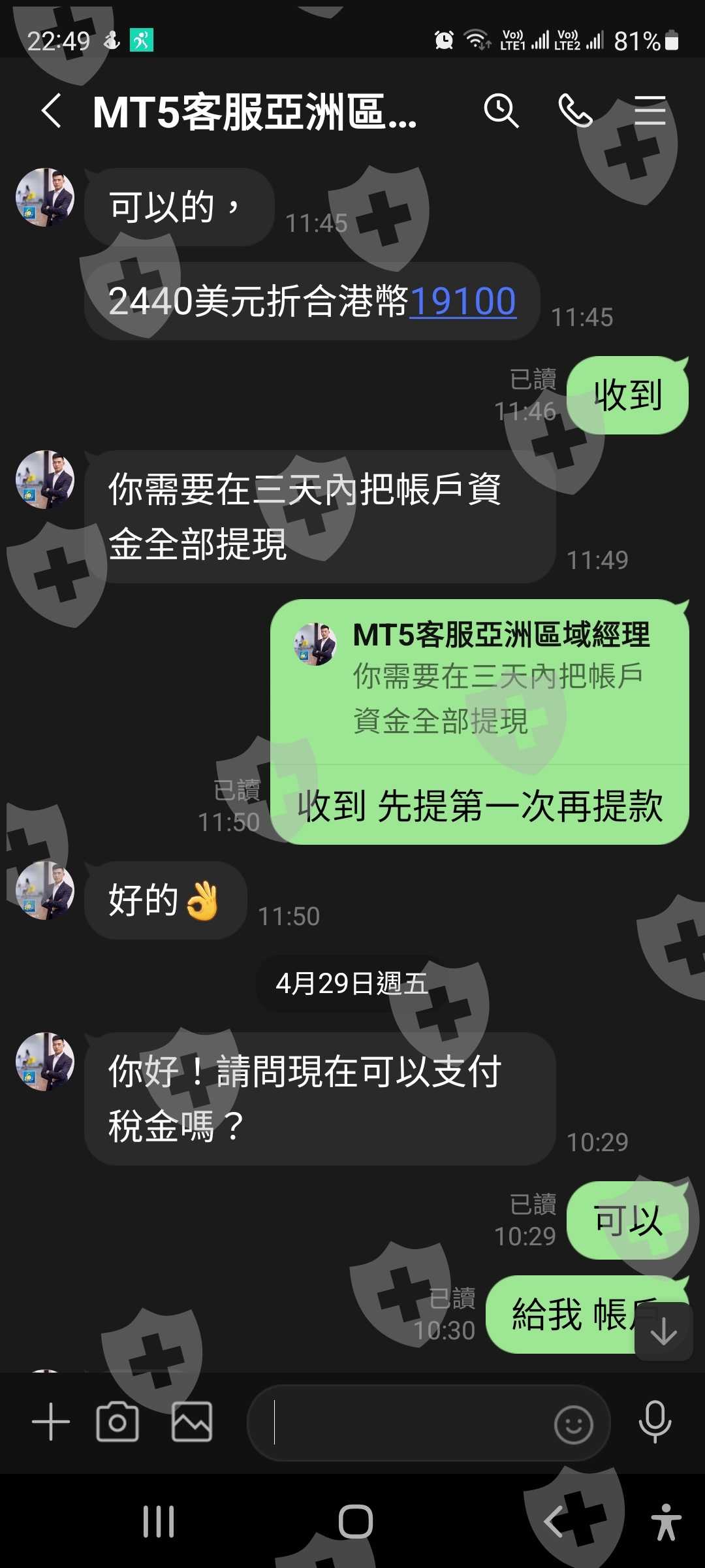 我 於4月30號2022年交了二千四百元美金作為 三萬美元的稅金客服承諾兩天內匯款的然後在5月4號2022年 發佈另一個消息 因為取消亞洲客戶所以必須要七天內全部提款七天以後就把所有款項捐出去 這個完全不合理的 所以期待你們瞭解入把款項歸還給我