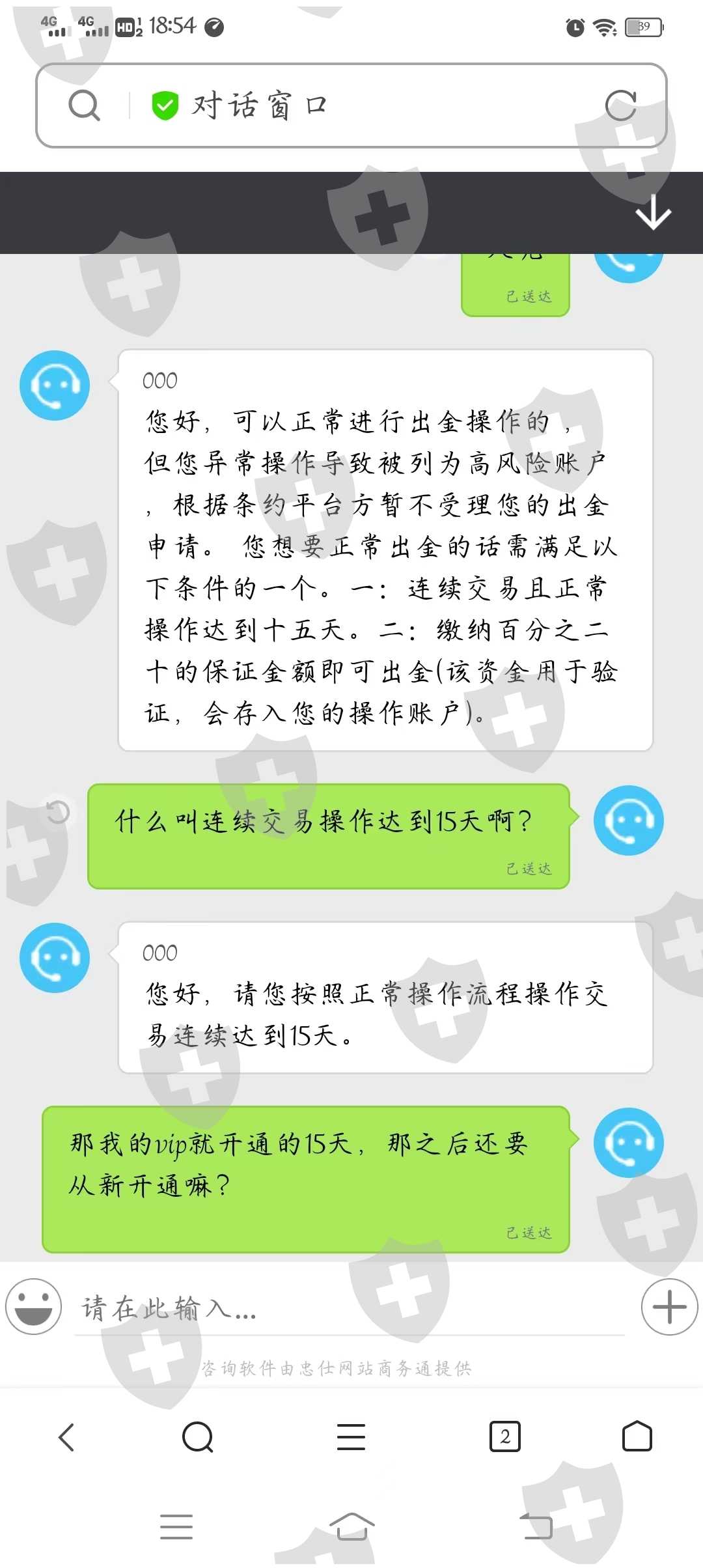 账户无法出金,我申请出金平台发邮件给我说要办理Vip出金通道,我就办理了一个888美金15天的,办理好之后再次申请出金,又说我的账号存在风险让我缴纳账号本金的百分之20,或者连续操作账号15天,我没选择交钱,选择连续操作账号15天,结果刚操作一天就把我账号冻结了。又让我交。明显的诈骗