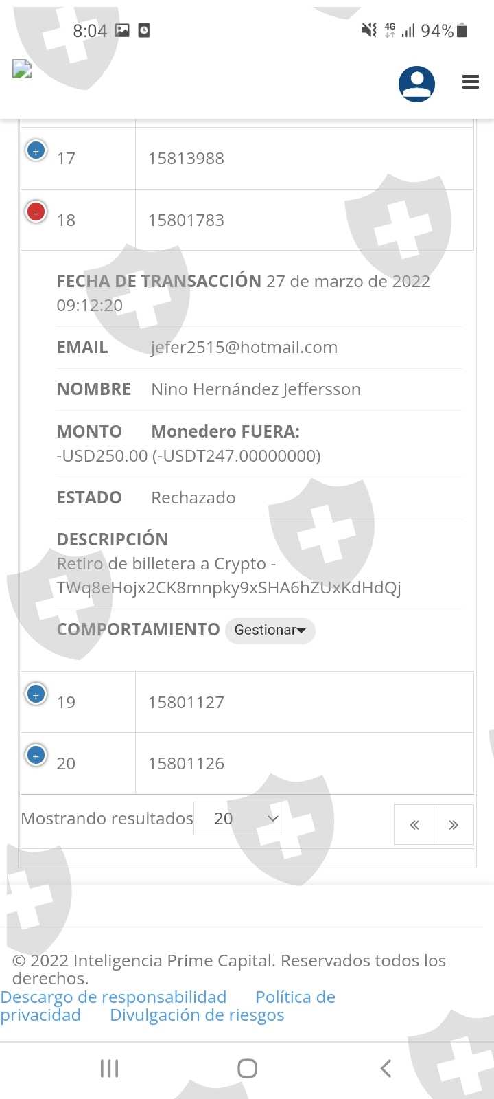 自 3 月 27 日起不允许提款,提款被拒绝 247 美元,我总共没有返回钱包我无法在我的帐户中提取 856 美元,mt4 停止操作,他们未经事先更改货币通知或授权