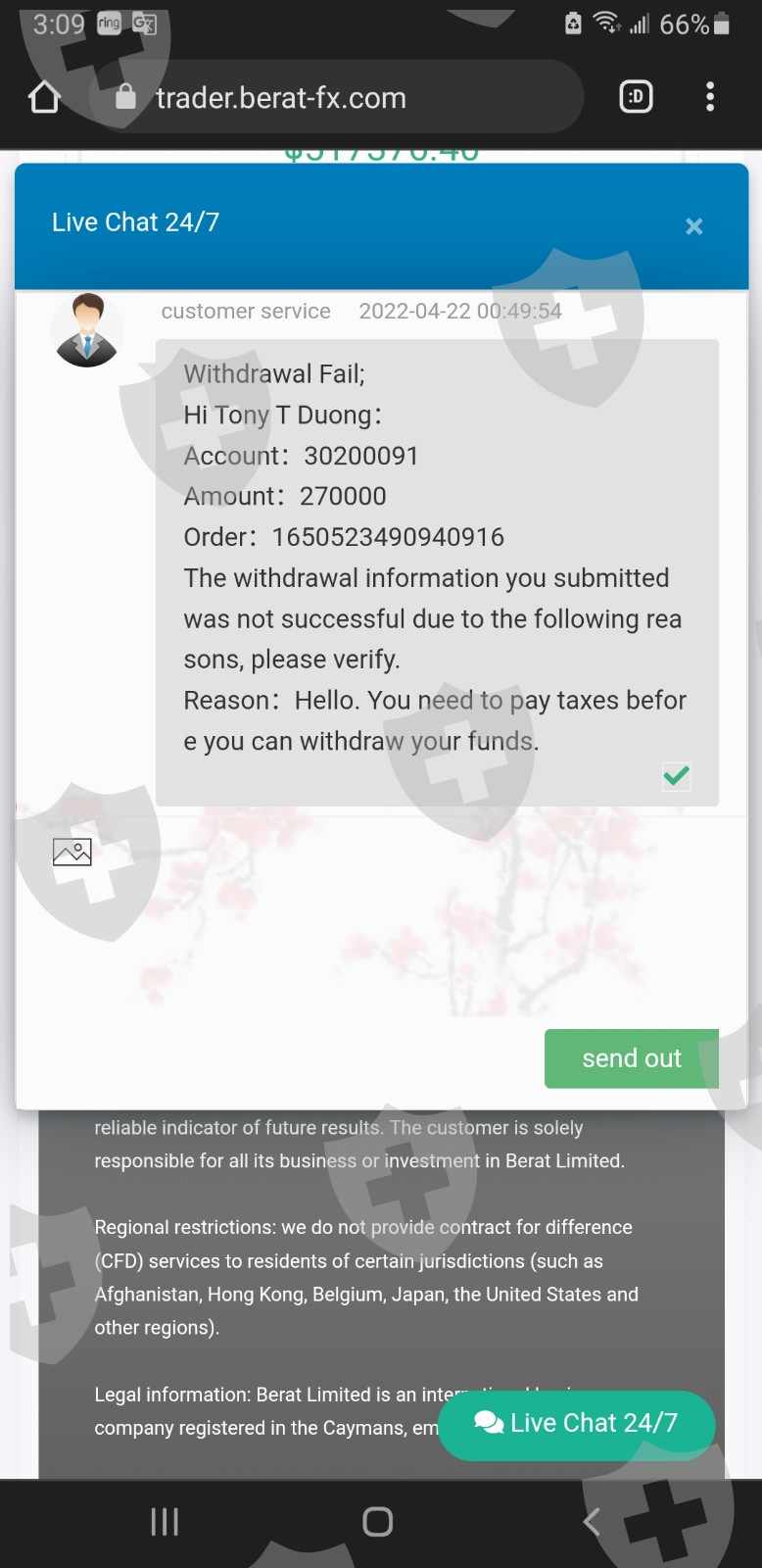 The deposit is USDT 310000. Trade profit is USDT 207287. The balance now is USDT 517376. When I requested to withdraw money. The customer service rejected my request and asked me to pay extra 10% tax is 51737.64USDT separately instead of direct deduction from my balance. Tax must pay under USDT cryptocurrency through them to Hong Kong Inland Revenue Department which is not persuasive for me to believe it at all. They are offshore broker accepting deposit without any questions but asking 10% tax when to withdraw. Please contact their manager to step in to solve my problem. I want all my funds back without any issues. It is not acceptable for asking tax when Hong Kong Inland Revenue Department confirm by email to me :"We do not charge personal income tax or withholding tax on investment income and capital gain. You can follow this link (https://www.ird.gov.hk/eng/pdf/tax_guide.pdf) for further information on the tax system and collection of taxes in Hong Kong." more "The amount of tax payable in Hong Kong dollars (instead of foreign currencies or cryptocurrencies) and the due date for payment are stipulated in each notice of assessment served to the taxpayer’s last known postal address." But they asked me to pay my tax to their tax crypto wallet at: "Tax address: 0xdF86B385a0E9231Ec9891991B27CB775e290a84D"