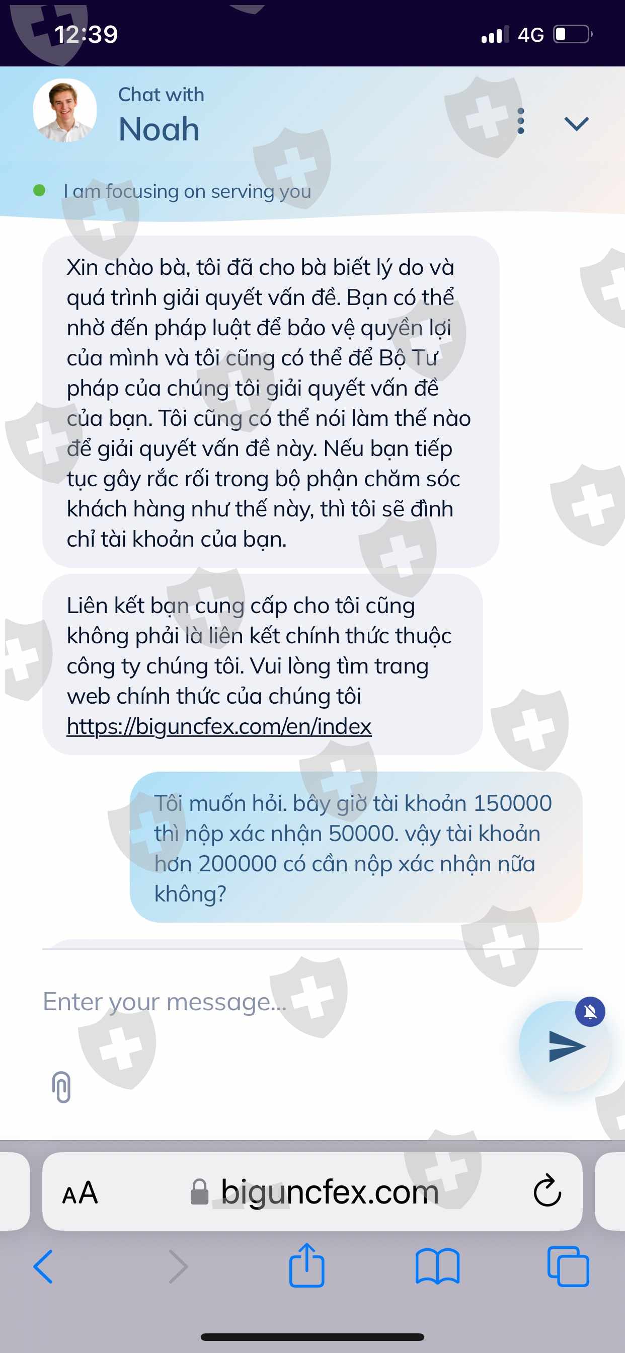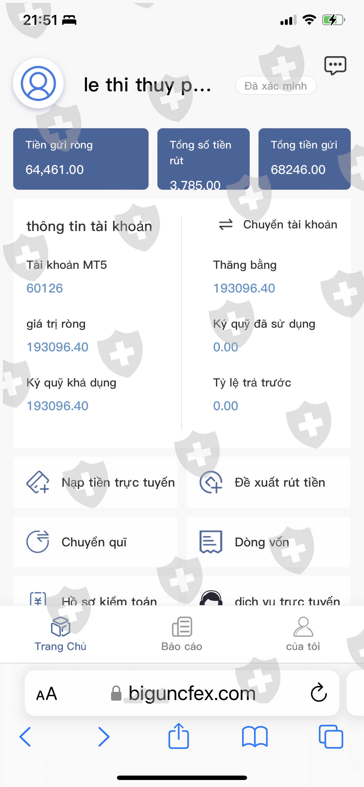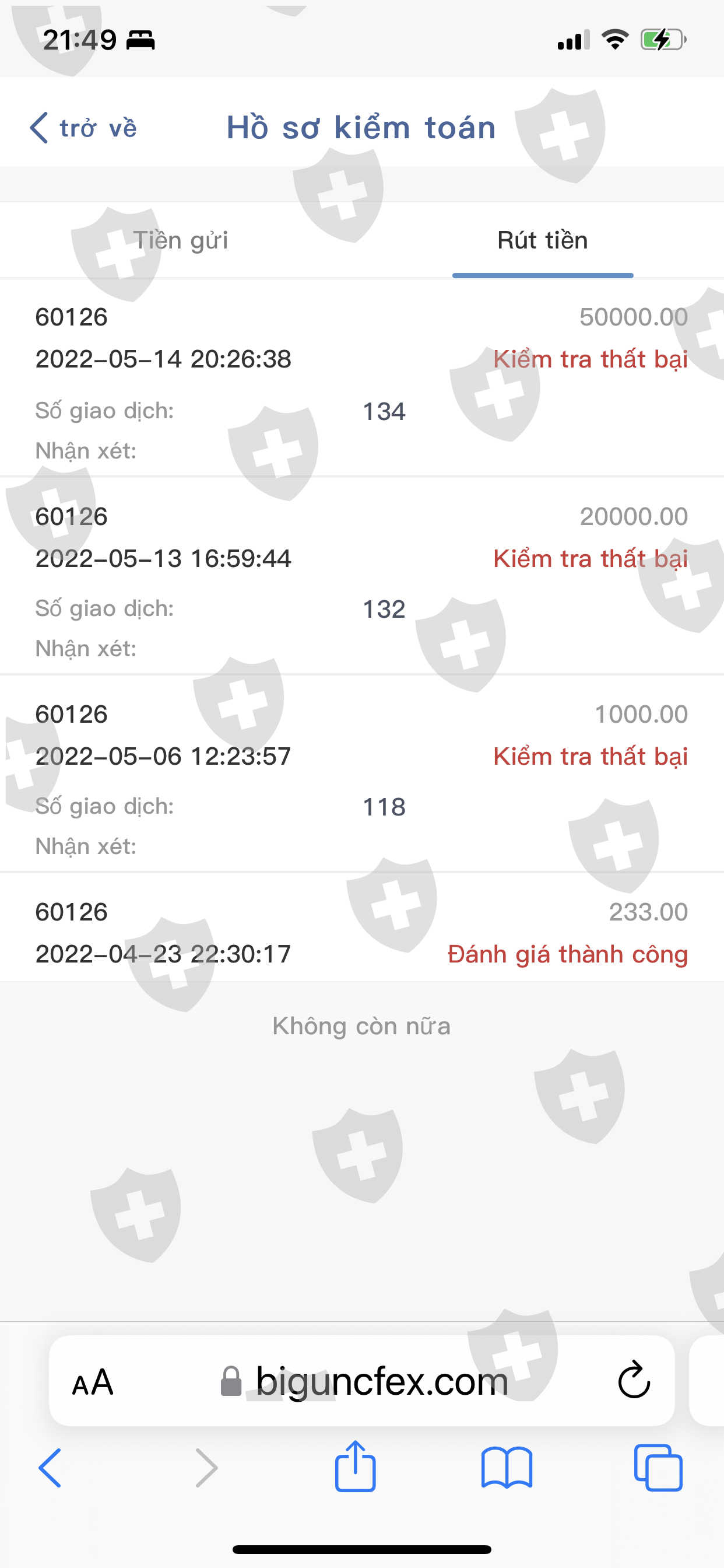 Tôi là Lê Thi Thuy Phuong. tôi có đầu tư vào Mt5 tk số 60126 qua sàn Biguncle. Sau rất nhiều lần tôi rút tiền đều bị từ chối. Họ đưa ra lý do tôi cần đóng phí xác nhận 50000 thì mới được rút tiền. Tôi khẩn thiết yêu cầu can thiệp để sàn Biguncle trả lại tiền cho tôi.