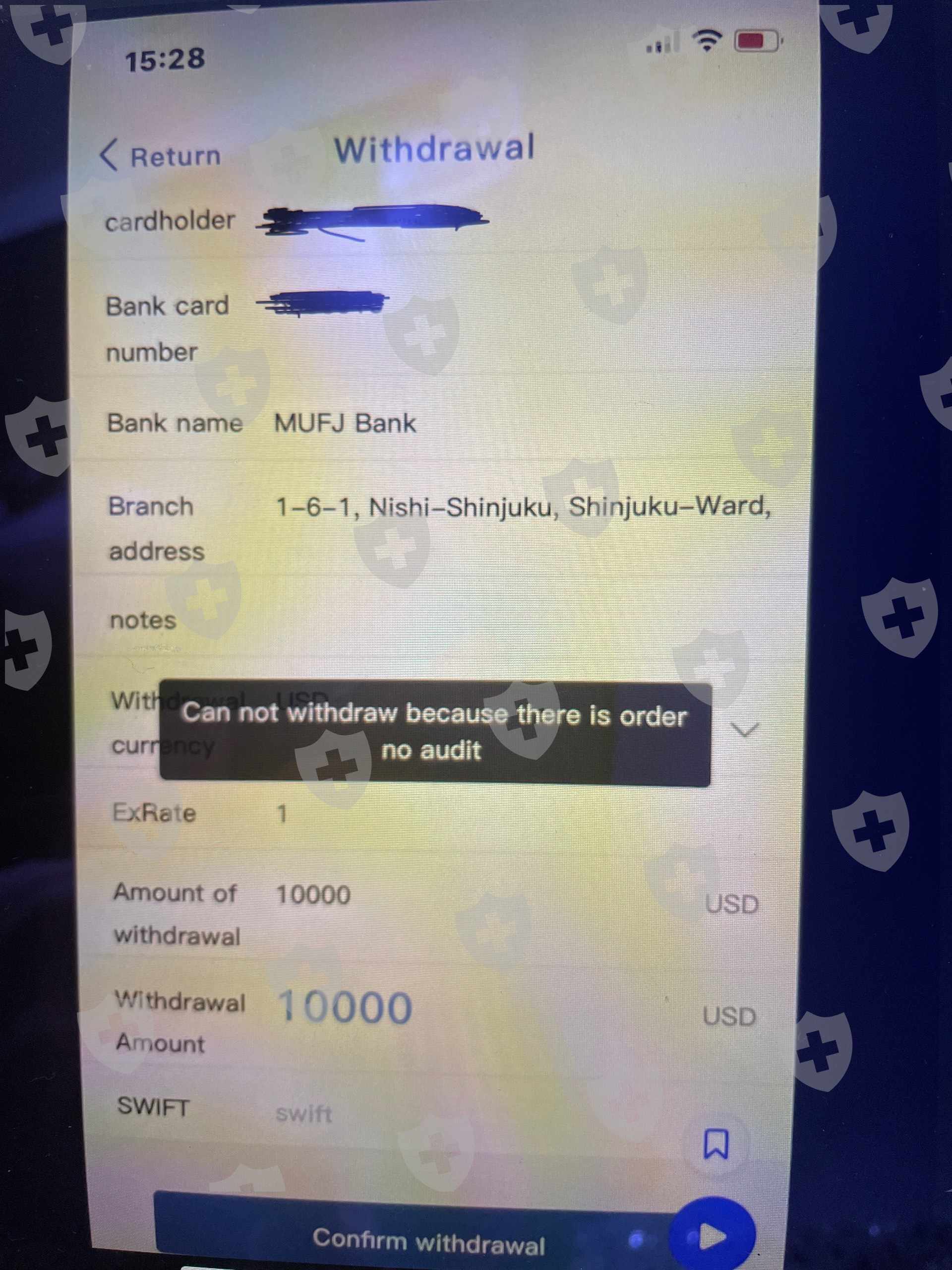 Starek在co开户时,我在sns上认识的一位女士把我介绍给一位称我为老师的前华尔街基金经理人,然后又介绍了该男士介绍的其他几家中介的银行账户,一共11,400美元。通过转账存入保证金。按照他的指示进行投资,获利20,000美元,账户资金超过30,000美元。然后,当我在 4 月底要求提取资金时,我被要求预付 20% 的税款。至此,我怀疑有欺诈行为,试图通过转账和提取2000美元来收回我最初的10000美元投资,但最终这笔钱没有归还。问题是谁在接受这个提款申请。这种情况下,是男介绍人吗?和, Starek为什么即使co可以在会计上注册银行账户,收到的资金也不能直接转移?认识他的初期,4月初,我在自己的账户页面申请了两次100美元的提现,都被屏幕接受了,其中100美元是通过别人的账户转账的。简而言之, Starek这不是从公司直接转移。当我向警方报案时,似乎除了我之外还有其他受害者,至少三个涉及资金转移的账户在警方的指示下被银行冻结。如果 Starek如果联合交易所很难,请找出这个参与注册我账户的前华尔街基金经理人,并立即冻结他的账户。而我账户里的30,000美元,我只需要11,400美元的押金,所以请帮我退款。