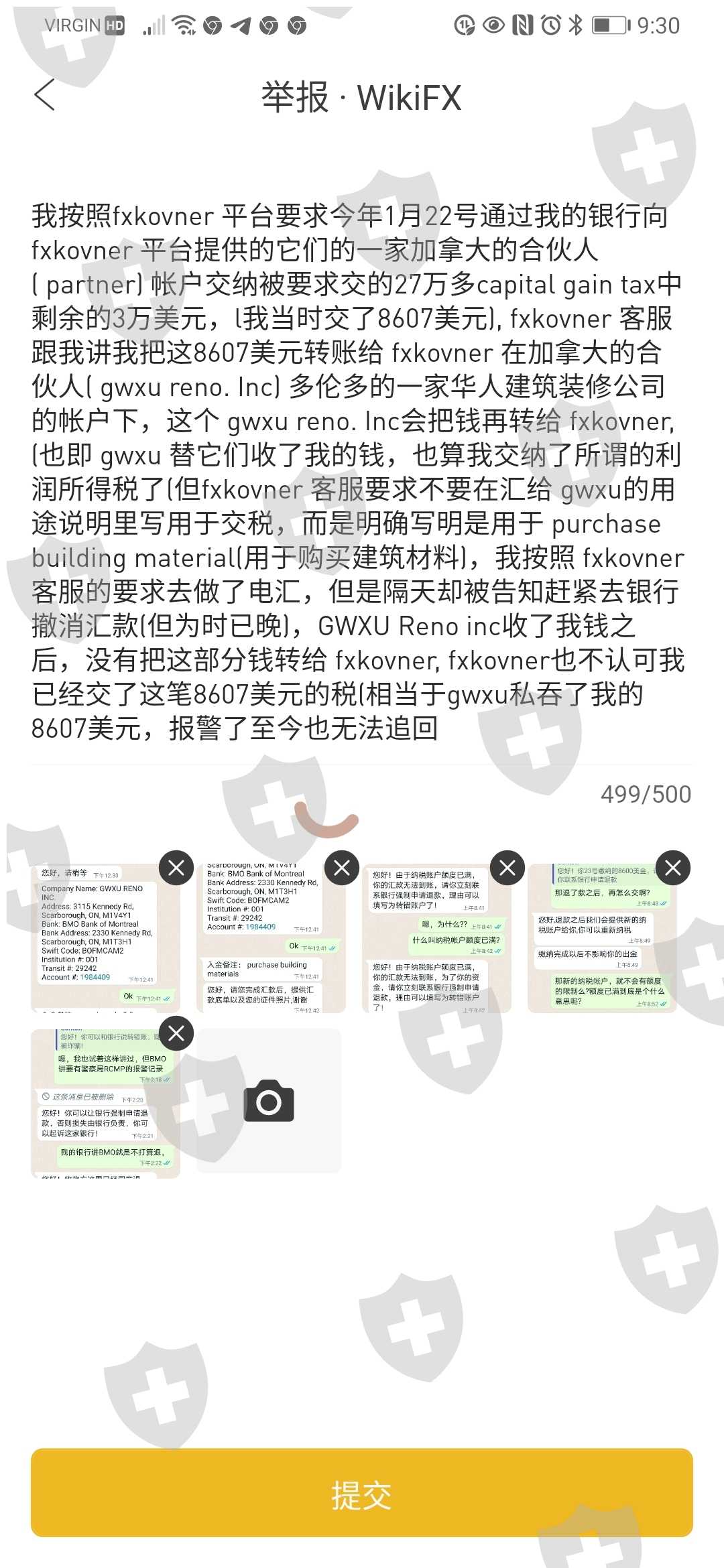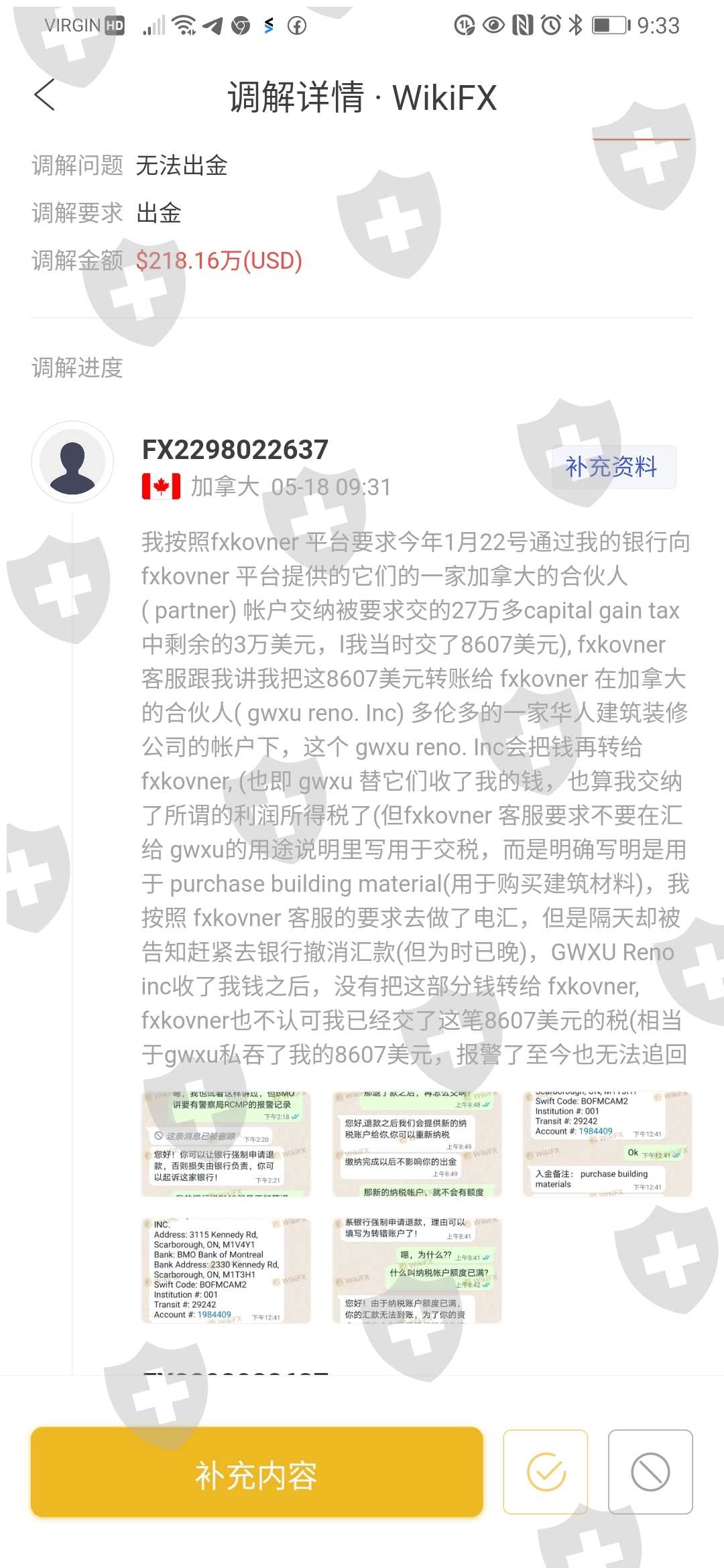 今年1月22号,我被fxkovner 客服要求尽快交纳27万多美元capital gain tax中制余的3万美元(此前我已经交了这27万多美元中的24万),而且 fxkovner 为了让我确信这不是scam, 给我提供了一家它在加拿大合伙人公司的帐户,讲我把钱转给加拿大多伦多的这家 gwxu reno. Inc(Gwxu 建筑装修公司)与转给 fxkovner capital holding group是一样的,(gwxu reno inc. 收到我的钱之后会再把钱转给 fxkovner 平台),也视作我已经交纳了个人所得税,我去我的银行办理电汇转帐时被fxkovner 客服要求在汇款用途时不要注明是交纳个人所得税,而是要写 purchase building material(用于购买建筑材料),我只能照着 fxkovner global capital 的客服要求照做了,去银行汇了款,但隔天却被 fxkovner 客服通知赶快去我的银行撤消那笔汇款(但为时已晚,我的银行已按我的要求把钱汇到GWXU Reno inc. 的帐户上),GWXU收到我汇款之后也没有转给 fxkovner global capital holding 的平台,fxkovner global capital holding 的客服也不认可我已经又交了一笔 capital gain tax, (相当于 fxkovner 平台与它的加拿大合伙L Gwxu reno. Inc. 之间发生了龌龊,而我被欺骗于其中),我向加拿大警方报警希望从GWXU Reno. Inc 取回我的那笔用于支付 fxkovner 讲的用于支付所谓capital gain tax剩余部分的钱,加拿大警方调查之后通知我没有可能向 Gwxu reno. INC. 追讨回我汇往 Gwxu reno inc 的钱....