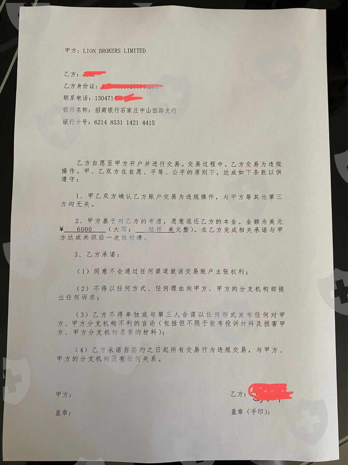 我本人于2022年4月29日入金六千美金,截至5月4日,盈利2260美金后申请提款。至5月11日一直未到账,期间催促多次无果。直至5月12日,客户经理说我订单有问题,只能给我出本金。。。我让客户经理指出我哪个订单有问题 他又说不出来。还说我是做什么报价延时。出于无奈,我让狮子金融先给我出本金,他们却逼迫我签下违规交易承诺书。5月18日(今天)终于到账,结果还不够我的本金,我本人入金汇率为6.38,出金汇率为6.25,最重要的是 最近人民币一直在贬值,今日人民币外汇牌价为6.75,狮子金融你还要点脸吗?