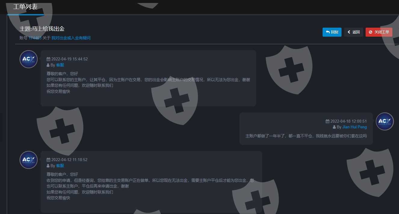 联系acy平台出金,不给出,理由:主账号还在做单,无法出金。