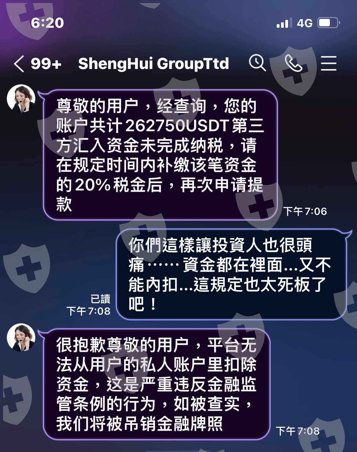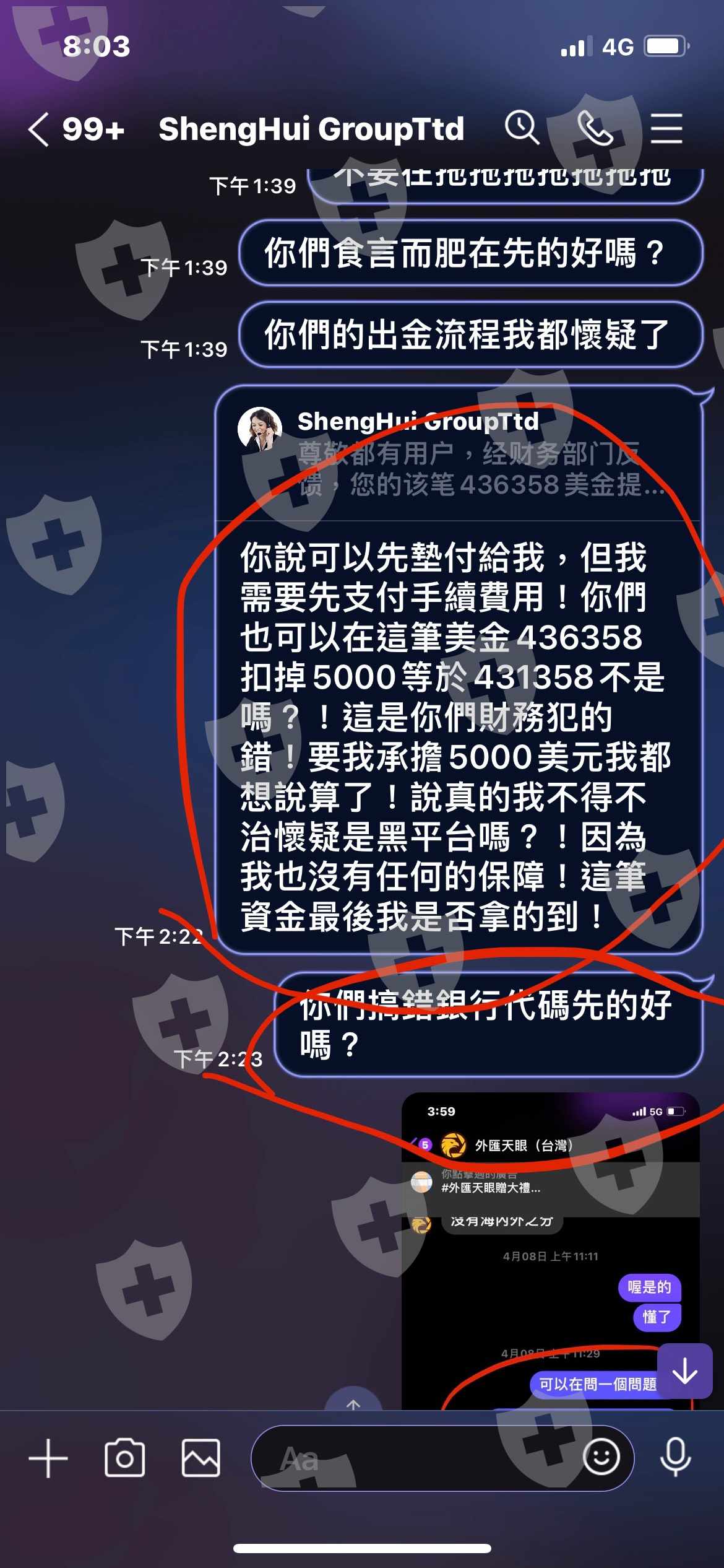 在3/25我有申請調解,因為平台告知我要繳納20%的稅金才可出金,後來平台在3/29號出金,結果平台搞錯銀行代碼,4/5平台通知我說因為資產糟凍結,需等待30~50天解凍後,會通知我,但是平台竟然可以犯這種錯誤,銀行代碼搞錯.平台也告知我可以先墊付5000美金,可以快速處裡,這5000美金會自動存入我的交易帳戶,5/4號我麻煩平台幫我查詢還有多久解凍,平台竟告知我還有75個工作天,我可以繳納5000美金保證金可加速處理,即可申請解凍!平台明明就告知我30~50天,又說時限為90天,說我因為惡意騷擾!