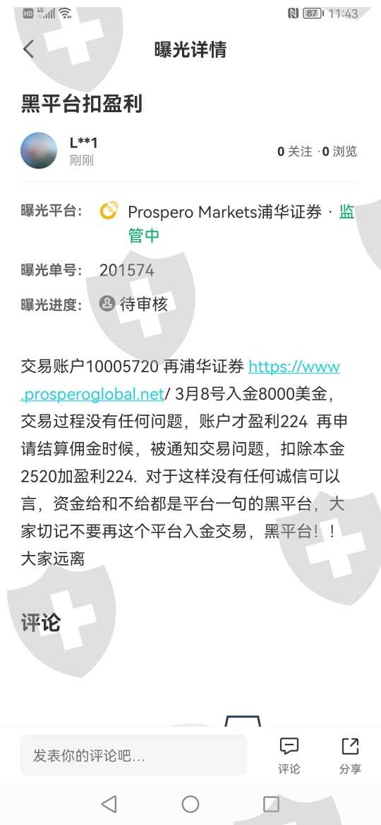 交易账户10005720 再浦华证券 https://www.prosperoglobal.net/ 3月8号入金8000美金,交易过程没有任何问题,账户才盈利224 再申请结算佣金时候,被通知交易问题,扣除本金2520加盈利224. 对于这样没有任何诚信可以言,资金给和不给都是平台一句的黑平台,大家切记不要再这个平台入金交易,黑平台!!大家远离