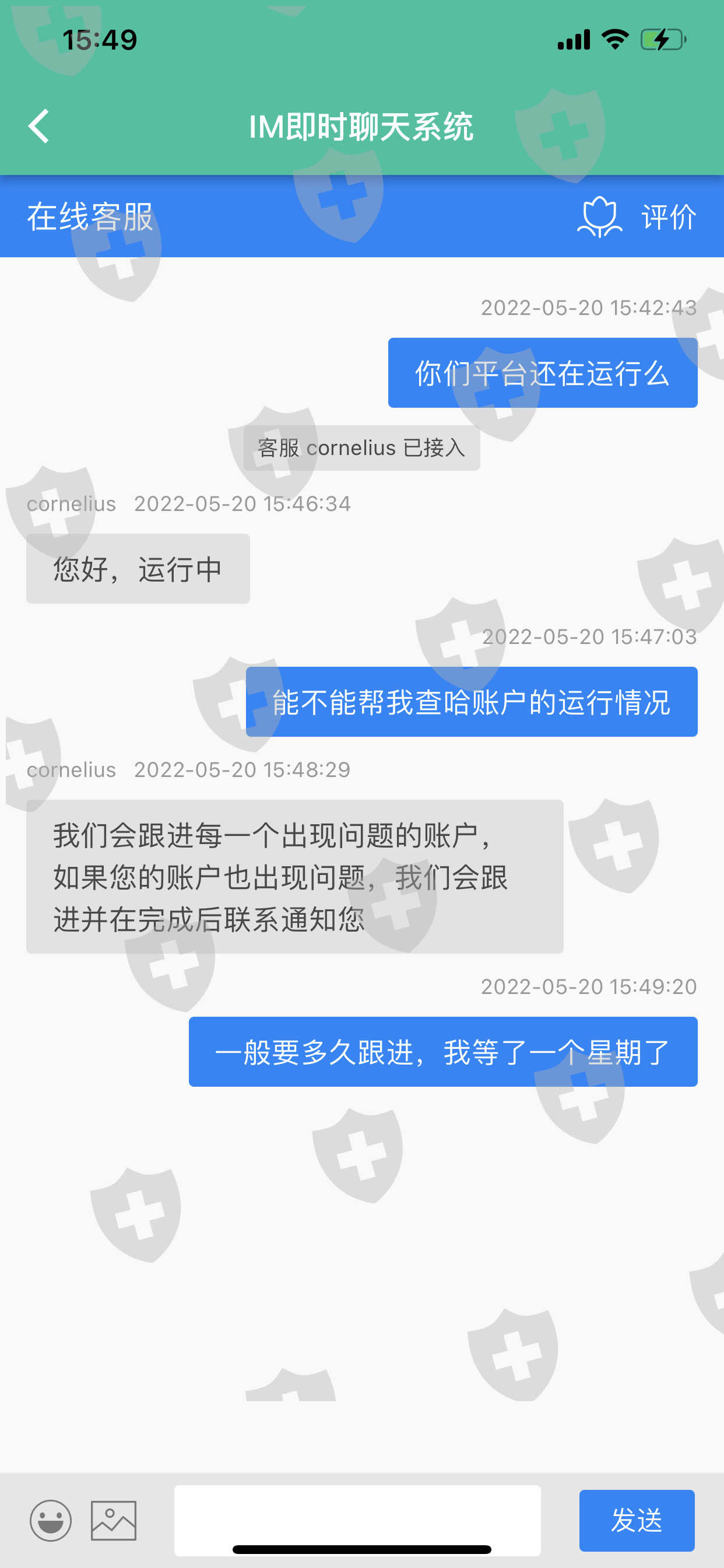 账号当天就无法操作,咨询了几次说在处理,结果过了几天账号就无法登入,闪退,我以为手机的问题,结果用别的号码注册就可以登入,到现在出金也没到帐,不知道该像谁求助!平台依旧还在运行,苹果官方商城的app