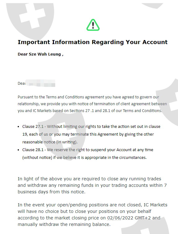 本人於前兩天收到這終止帳戶電郵和發現不能出金, 已經馬上從電郵, ZENDESK多方面去查詢, 並要求一位之前曾經致電本人而且也會說廣東話的客戶經理再次致電本人協助。這位經理於上星期曾協助處理出金問題,他當時也承認ICMARKETS的財務人員比較亂,而且他也很尷尬不能說得太白。但問題當時總算處理了只有短短幾天。昨天,本人收到ICMARKETS CHINA TEAM