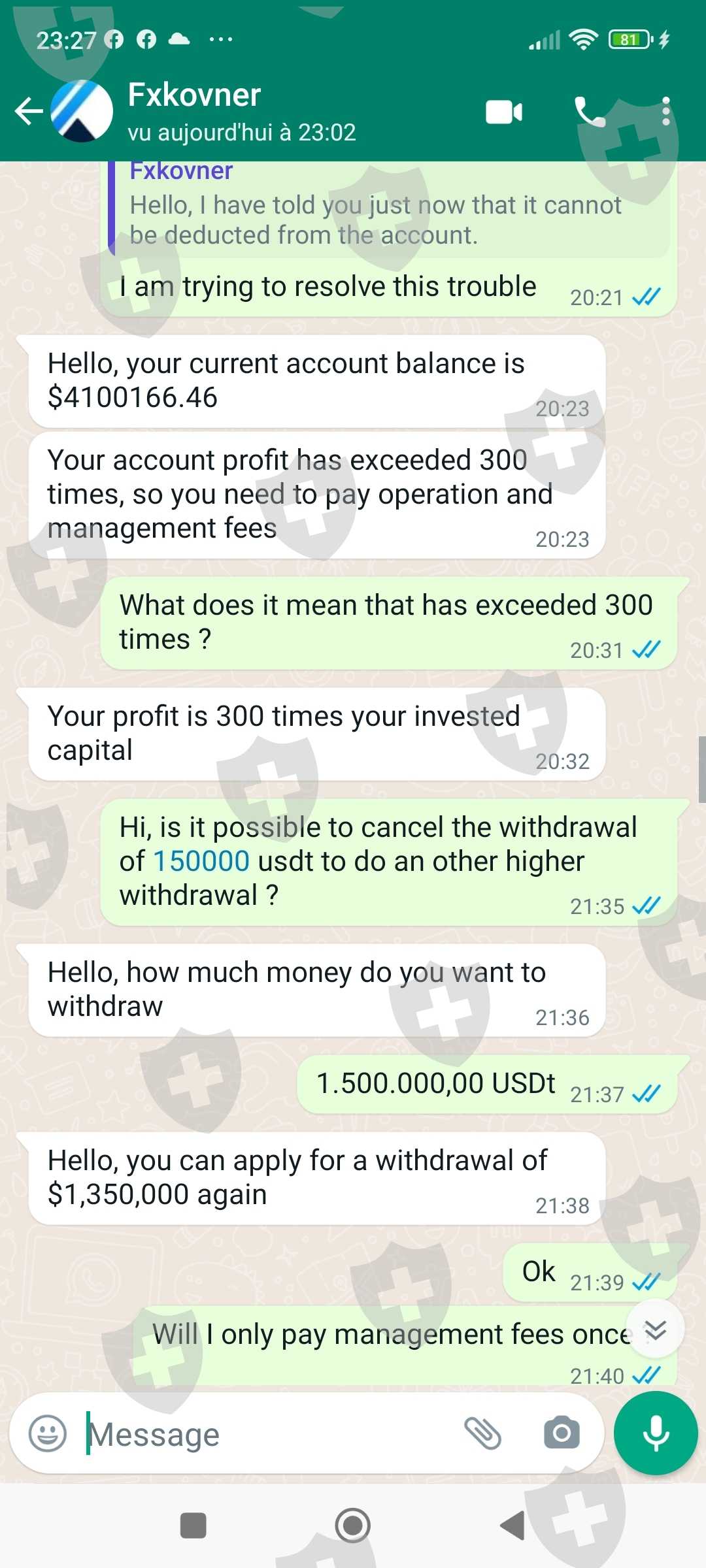 After several months of trading and a reach of $4 100 166, i made a $150k withdrawal. But this withdrawal was conditioned by the payment of an operational fee of 2% of the account amount, so $83,700.75 to be paid withing 14 days before a penality of 5% per day of delay. Of course, the customer service told me that the operational fees can not be deducted from my account and must be paid by myself in USDT. These fees do not appear anywhere on the website and no negociation is possible to reach the settlement of this sum.