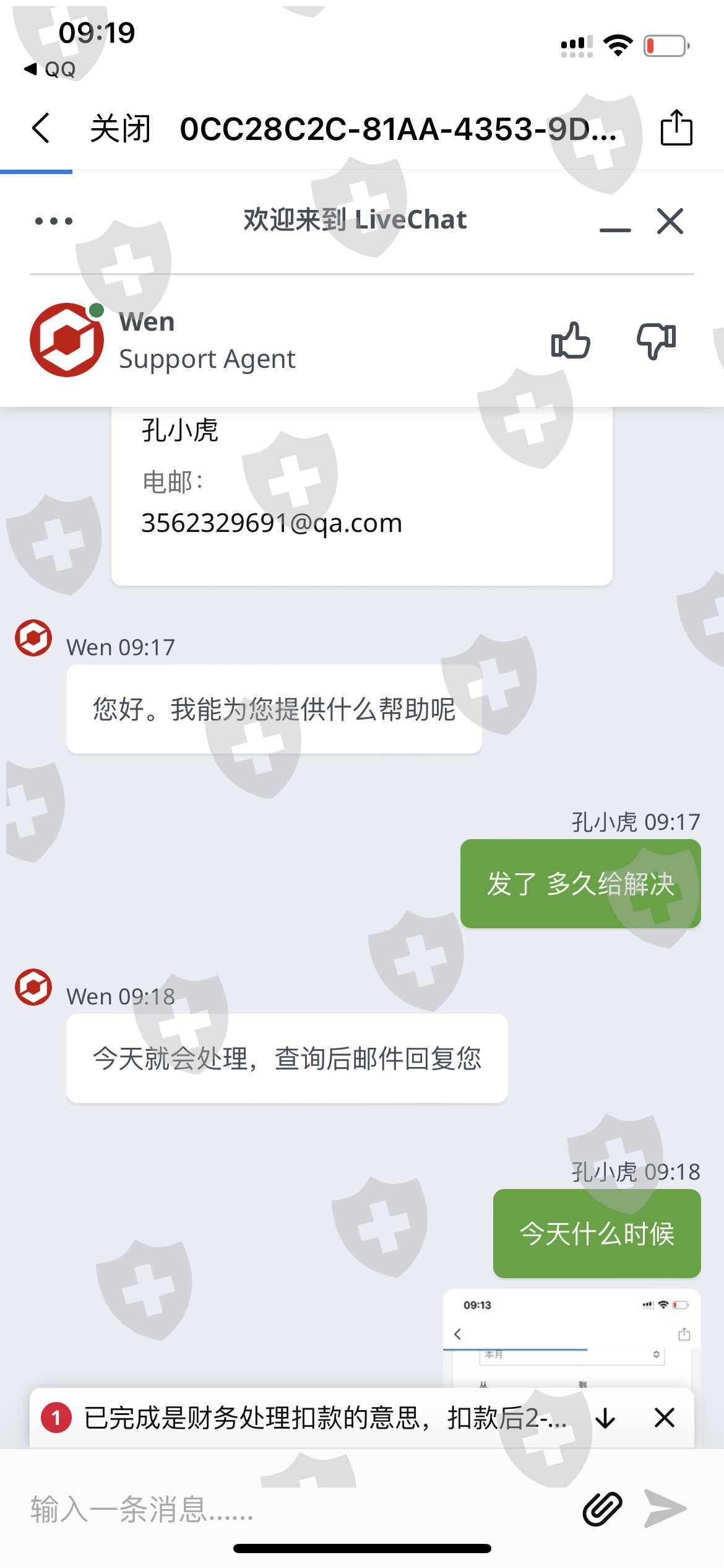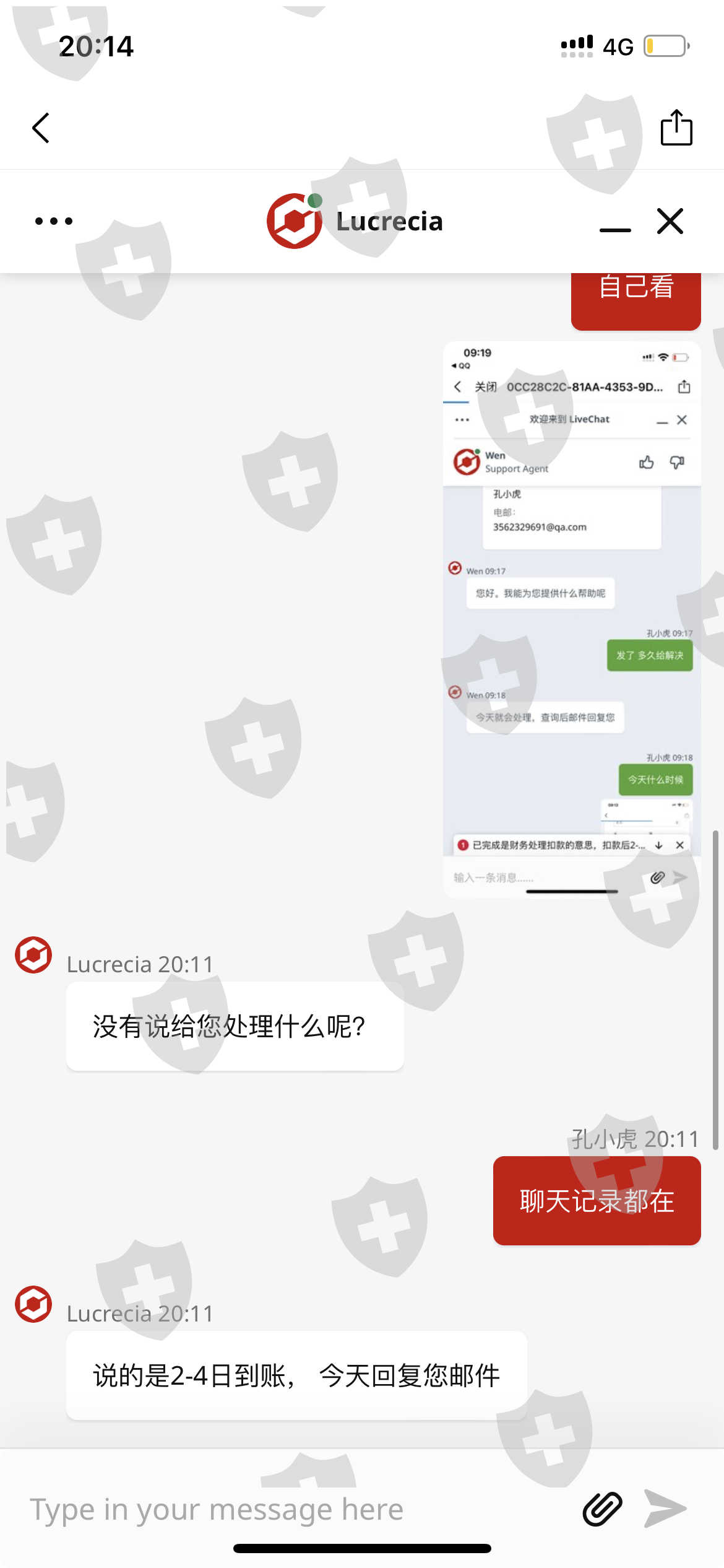 1客服一会说支付商通道有问题延迟出金,2又说今天给处理3不给客户处理事情,果断把客服聊天框切段4总是敷衍2到4个工作日到账