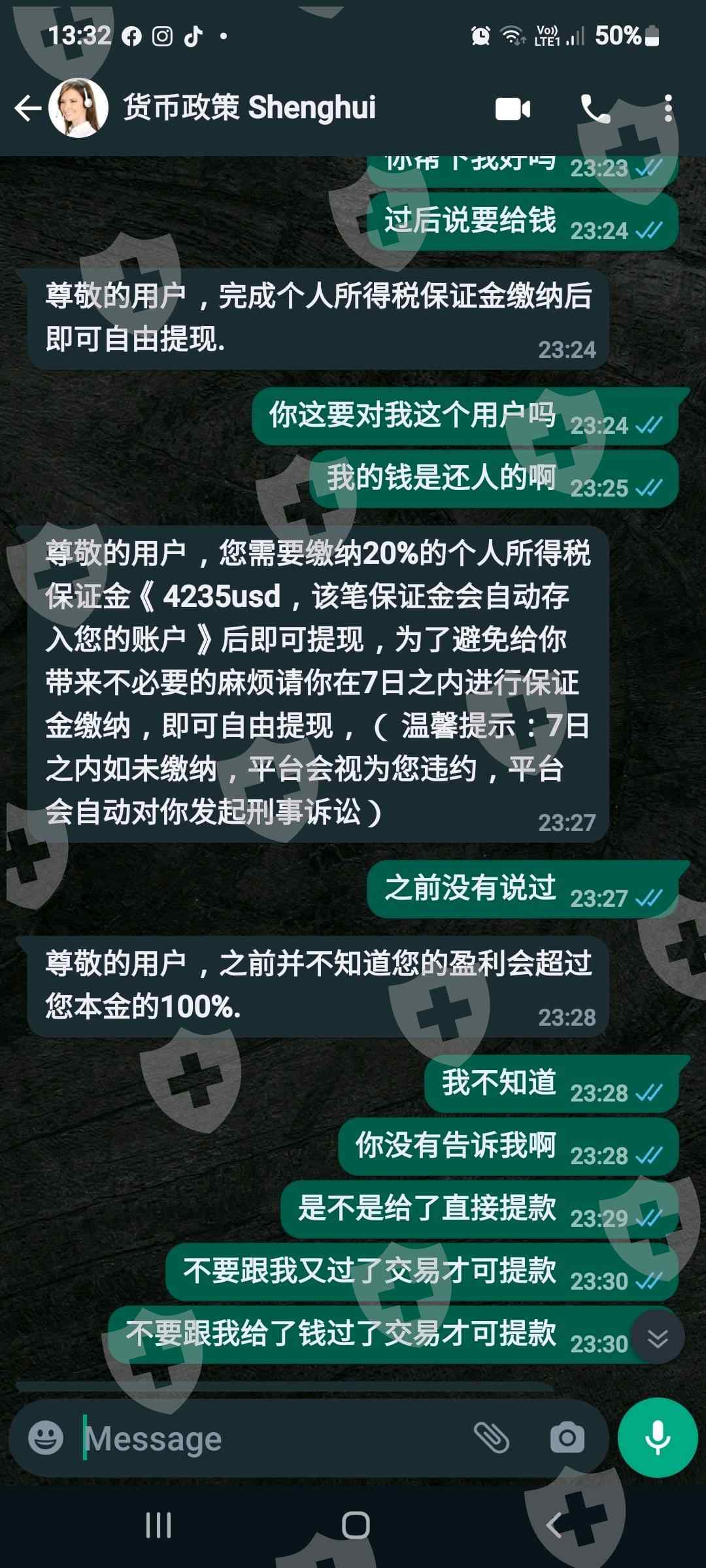 本人2022年5月17日 通过 shenghui Group Ltp (https://www.shenghuigroupax.com) 注册及入金在metatrade5做交易,shenghui Group 交易帐号211734 ,在2022年5月26日 通过broker客服申请出金9000USDT被拒绝,需要给百分之20%保证金才可以提现,在还没有提现之前客服没有告诉我需要给这些保证金的,我自己放钱进去也需要自己给保证金才可以提现? 保证金已经给了2000USDT. 我希望可以帮调解下好吗?