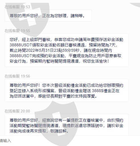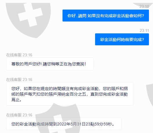 網路上認識聊了一陣子,帶領我操作黃金期貨xauusd.a每天都有賺錢,投入幾筆後,要出金,網路上也通過,成功申請了,但幾個小時過去了銀行帳戶都沒有收到錢。帶我操作的人出現了,問我說有沒有收到客服通知一個彩金活動,我說沒有,讓我去問客服要我參加。當我確定參加後,3分鐘內原本申請成功的出金,已經被取消。詢問客服說因為避免會員惡意提領拿到的彩金,會限制出金,直到活動完成。不能取消,直到完成活動才可以出金,超過活動時間,沒有完成活動每天會扣5%,直到完成活動。其實,他們一開始就不能出金了吧~