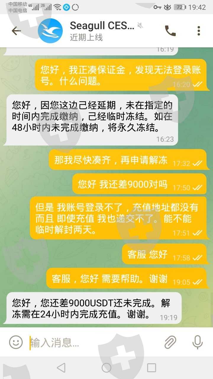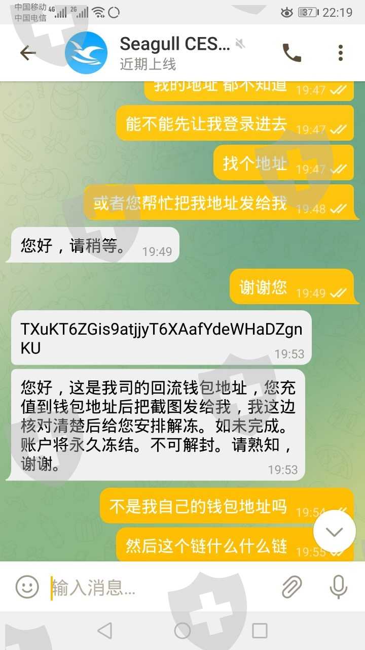 在4月9日至5月1号期间,本人不间断进行存入USDT并合约操作。5月1日,北京时间晚上10点多成功提取了5000USDT后,5月2日再申请提取5000美金,即无法提取,显示账户异常。经询问在线客服后,在线客服给了一个电报客服的联系方式 SEAGULL CES 064进行交流。电报客服说是本人涉嫌洗钱,非法套取平台资金等一系列子虚乌有的理由,同时要求我需存入盈利20%的风险金到个人账号,经风控部门核实后,才可以提币。(详细内容可参客服与我直接的聊天截屏)此时,我才明白过来,SEAGULL交易所就是一个专门骗人的交易所,小额盈利可以提取,大额全部限制。和客服沟通,无力承受存入20%盈利的风险金,自愿放弃全部收益,仅述求取回本金,但均被拒绝。后本人又筹借了2万多的U存到客户指定的地址,然后客户说3天后可以提取,过了3天后,尝试提取失败,客户又说需要缴纳20%盈利税大概15000U才可以,否则48小时后冻结账户,而后在没有存入相应的金额后,账户被限制登录,永久冻结,电报客服也被删。希望各位以我为戒,切不可相信他人带你赚取的诱导,不可在电报群相信任何陌生人,远离SEAGULL交易所。本人总共损失了10.7万U.