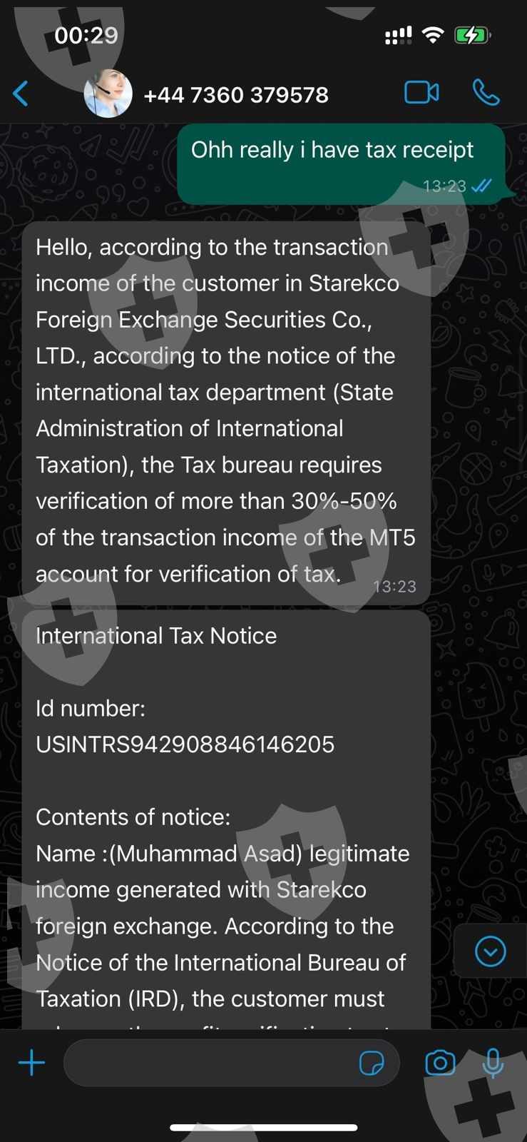 my principal amount is 17000$ USD they said i am going to paid 5380.86 more taxes to withdraw my money i can withdraw before after 3 transaction they said only 3 transaction is free if you want to withdraw you can paid 5380.86 taxes some Leena called girl told me to invest there they share her signal where can i invest and they lend 13000$ in my account to earn more they are using many tactic to fool you .she said she is doing this for our future and many things i found this girl on dating site so be aware guys.contact no. of her+85252996055+85256036151customer care no +447360379578email id -william0079@crmt4.comif any one found these guys who is behind please inform me+919506560000foreverasad@gmail.comStarekco account no . 38007890capital amount. 57152.21