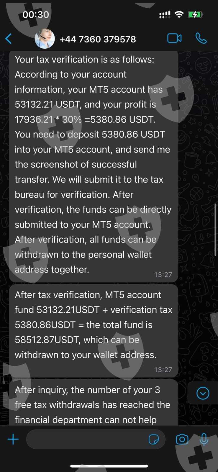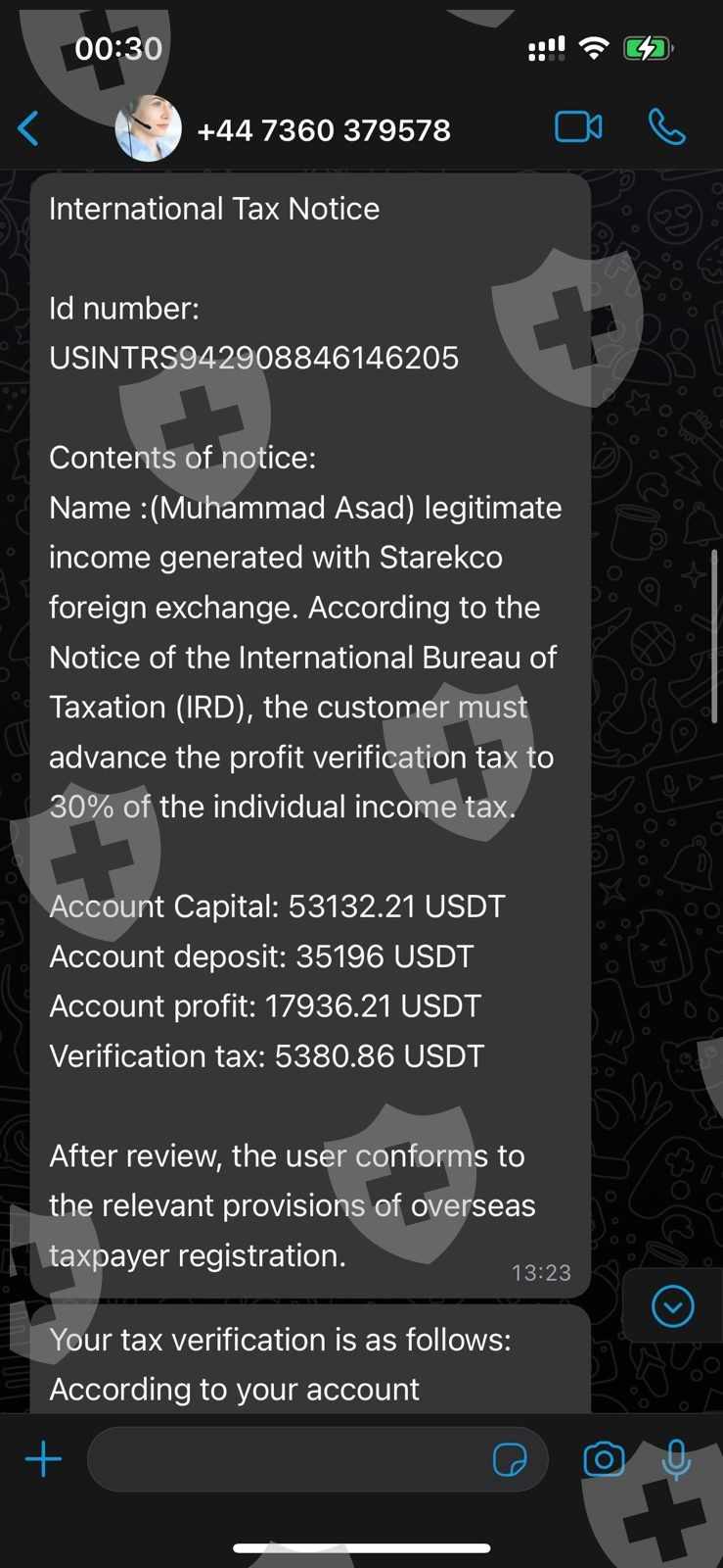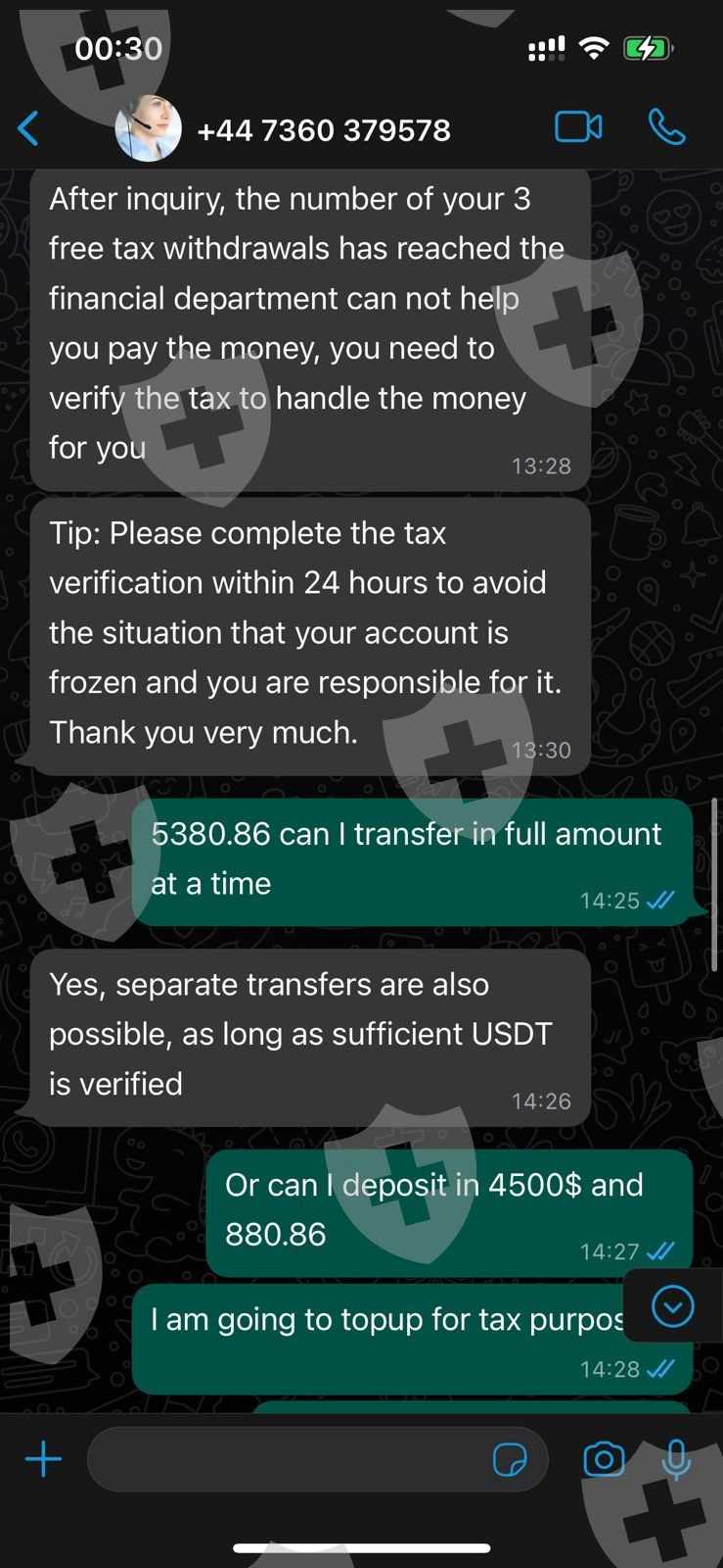 我的本金是 17000 美元 他们说我要支付额外的5380.86税款才能取款 我可以在3笔交易后取款 他们说只有 3 笔交易是免费的我在那里投资他们分享她的信号我可以在哪里投资他们在我的账户中借出 13000 美元以赚取更多他们使用许多策略来欺骗你。她说她这样做是为了我们的未来以及我在约会时发现这个女孩的许多事情网站所以要注意家伙。联系方式没有。她的+85252996055+85256036151customer care no +447360379578email id -william0079@crmt4.com如果有人发现这些人在背后请通知我+919506560000foreverasad@gmail.com Starek共同帐号38007890资本金额。 57152.21