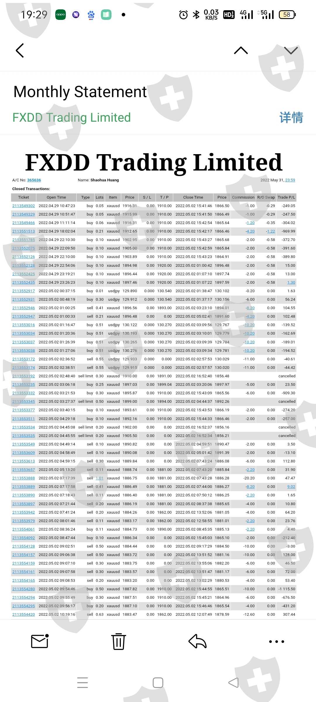 FXDD收取客户大量手续费,按20美元/手标准收取,再回报中间人,由中间人拿回扣,导致客户账户资金亏损加重,其中佣金损失占账户整体亏损比例达到25%~30%。
