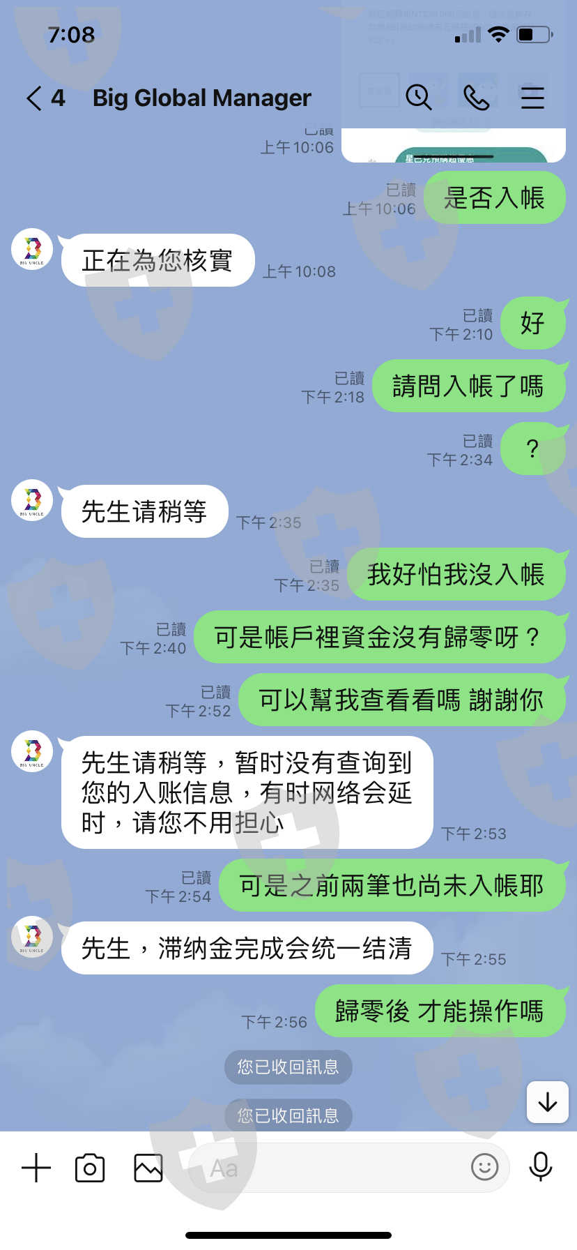 最後總共分別儲值次3萬新台幣三次後(2022/6/2)客服說會入帳成功帳戶會歸零,結果客服講話文字變成簡體字並 且不會再回應才發現它是詐騙(第六張圖),且現在的帳戶根本沒有歸零呀(第七張圖)