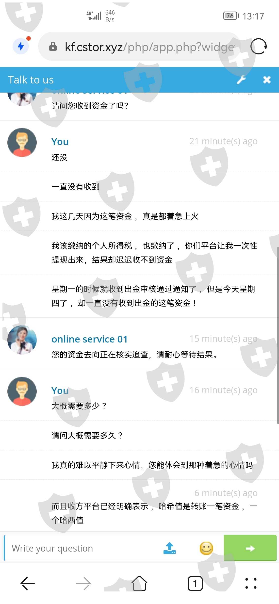 由于我的账号出金被风控了,客服说缴纳百分之二十五的个人所得税,要一次性全部提现!三天就能到收到转账,缴纳了安全沉淀资金后,客服说24小时就能到账,结果过了24小时,客服又说要等7到14天 才能收到转账 ,到现在一直没有收到资金到账!