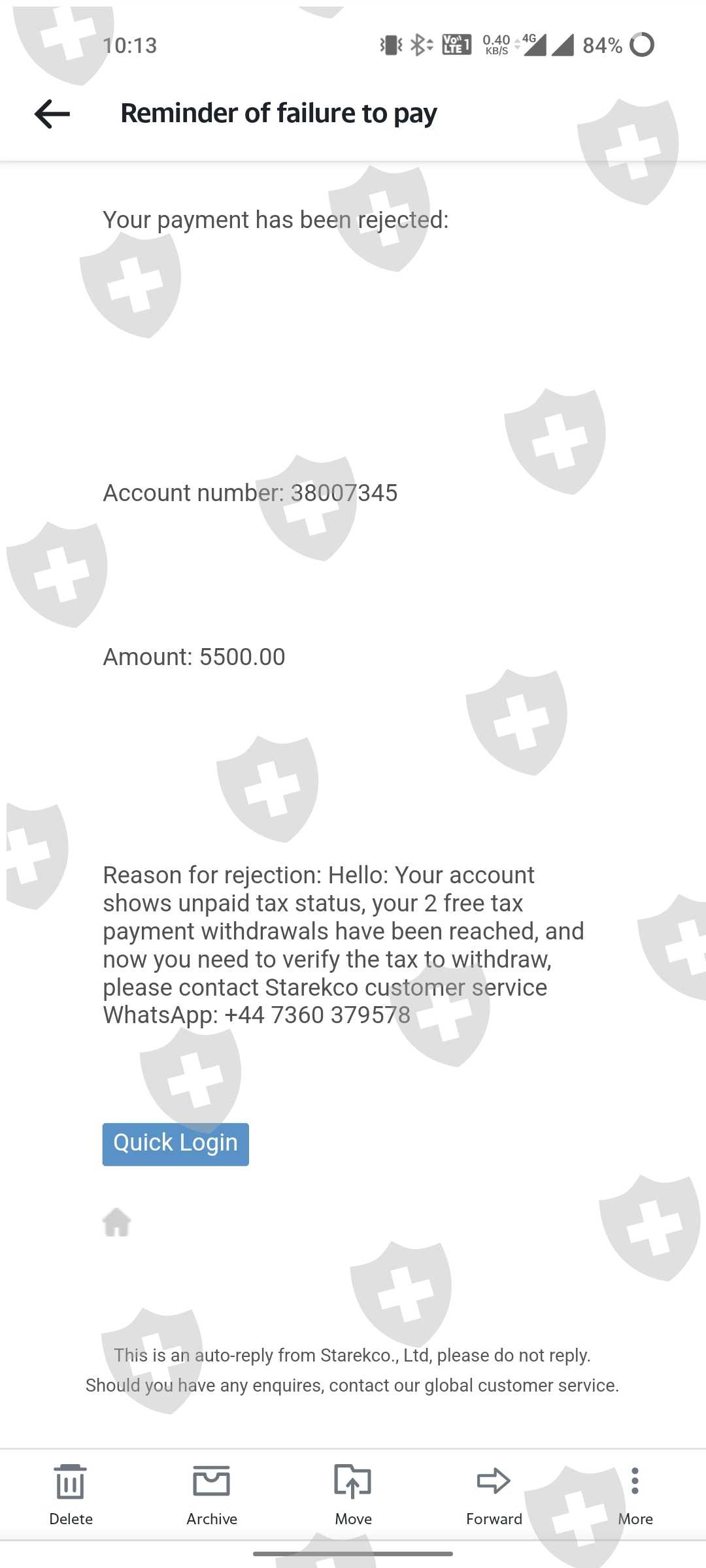 I have been scammed by Starekco where now i am not able to withdraw my earnings. Total balnce in my account is 47840.72$ and one lady also helped me in all this trading and she even lent me 6300$(screenshot of all deposits) attached. Now customer case is asking me to depsoit 3519.37$ since i was unable to withdraw 5500$. Kindly help.